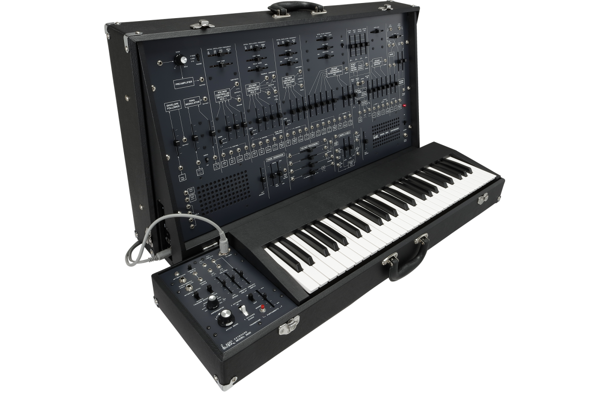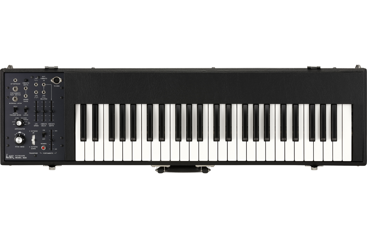 While faithful to the original design, the functionality of the 3620 Keyboard has been greatly enhanced for this limited ARP 2600 release. The 3620 Keyboard contains 49 full-size keys, aftertouch, portamento, and is also duophonic, allowing two keys to be played at once – Single or Multiple Triggering is available. In addition, the duophonic keyboard can use an optional foot switch to lock the interval between any two notes, without retuning the oscillators during performance. Vibrato can be added via a dedicated circuit controlled by aftertouch, or by the onboard LFO (Low Frequency Oscillator), using any of three available waveforms. Most noticeable is the addition of a flexible Arpeggiator that allows a user-defined pattern to be manually sequenced and played back. Still present are the original Pitch Bend knob and the Two Octave Up / Two Octave Down Transpose switch. Connecting the keyboard to the main unit now uses a secure eight-pin din cable.