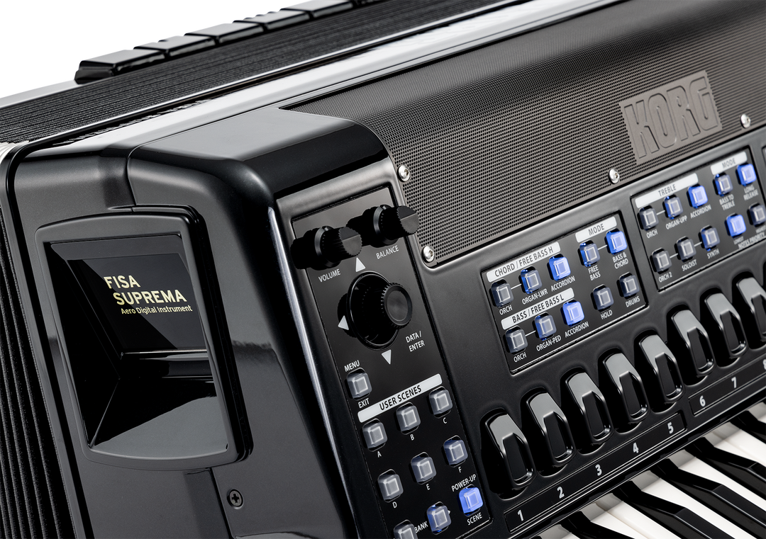 From button sizes and locations, proper angles and layouts, to the overall feel of the instrument, every aspect has been painstakingly designed by our team, which is located in Italy and has a strong background in accordion music. The FISA Suprema honours the heritage of KORG's co-founder, Tadashi Osanai, an accordionist, while providing an authentic and unmatched playing experience for accordion players of different tastes and styles thanks to this deep grasp of what accordionists actually require. Every facet of the FISA Suprema