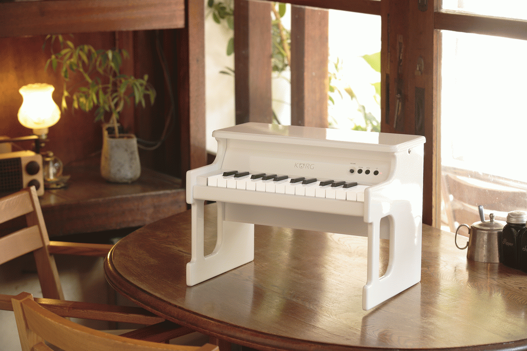 The cute design is essentially a miniaturized upright piano, with a fallboard just like on a real piano, and a miniature 25-note keyboard made by KORG for ease of playing. The body makes extensive use of wood for a solid feel when touched, giving it a sense of quality and sophistication that elevates the instrument above the category of toy piano, thus making it ideally suit the decor of any room