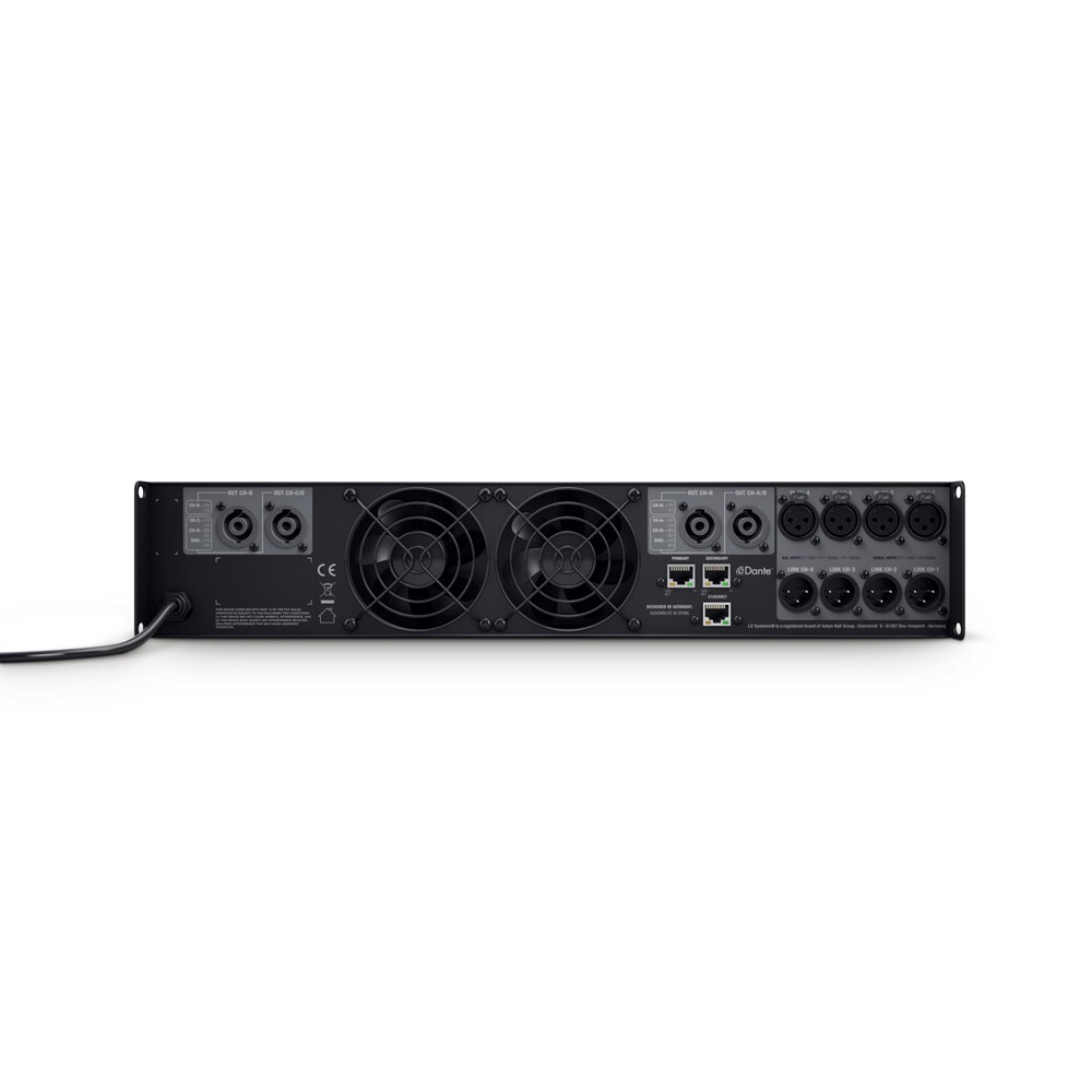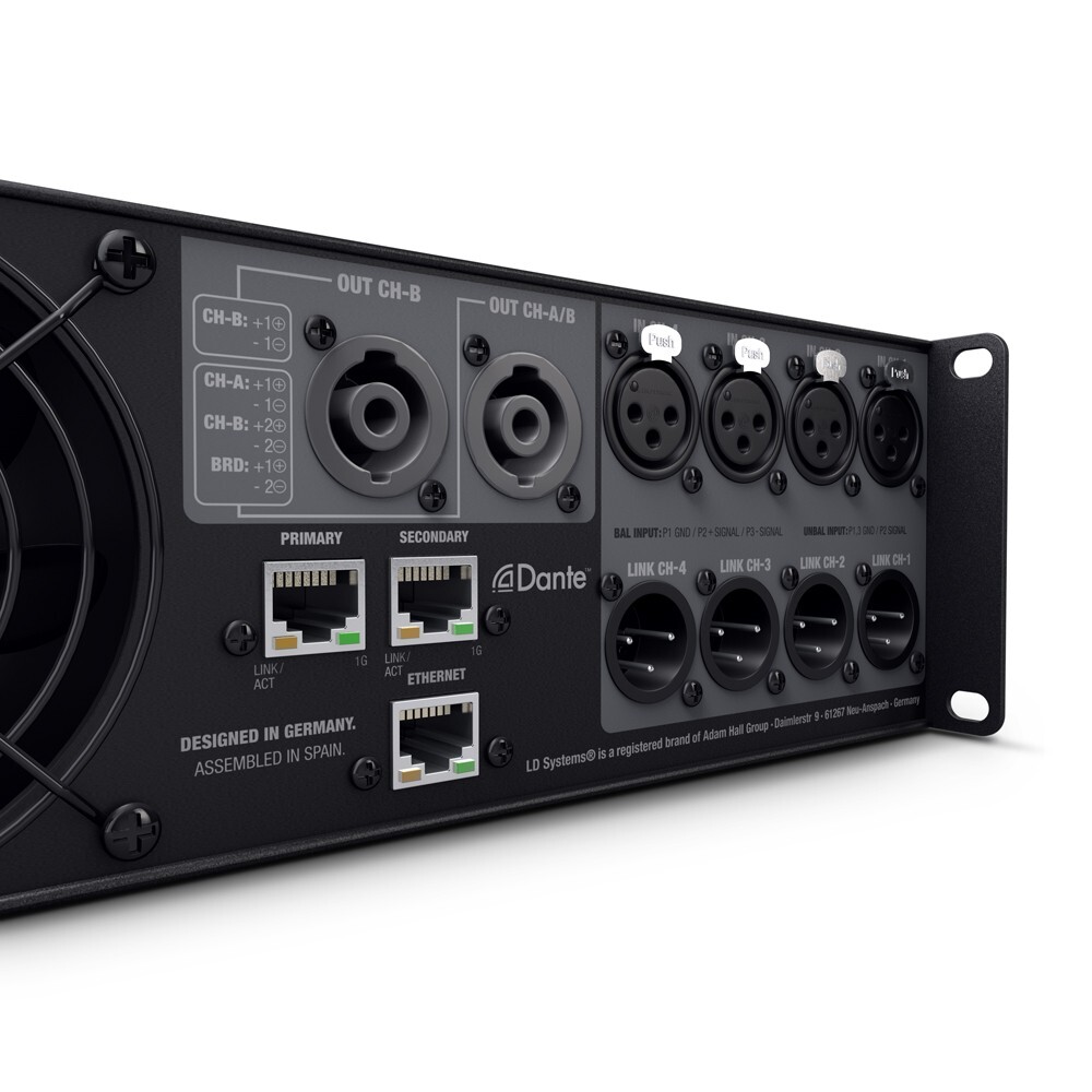 The LD Systems® DSP 44 K is a professional network-ready 4-channel power amplifier for demanding large-scale sound reinforcement. It includes extensive DSP control and Audinates Dante networking technology, a self-configuring solution to distribute digital audio over Ethernet with extremely low latency. Designed for concert-quality performance, the DSP 44 K delivers a massive 1,200 watts per channel and 2 x 2,400 watts bridged.