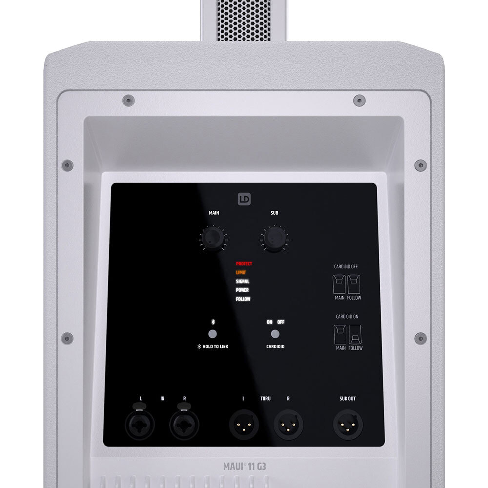 The columns of the MAUI 11 G3 W are designed as cardioid units. This allows for controlled low-mids at the front and up to 18 dB of attenuation at the rear, resulting in a clean stage sound. Equipped with two 8'' woofers and four bass reflex ports, the MAUI 11 G3 W subwoofer delivers a clear, tight and punchy low end down to 39 Hz. By using a second subwoofer, the bass response can also be increased of up to 6 dB and it can also be driven in cardioid configuration at the push of a button (cardioid preset). In addition, the ultra-durable polyurea coating of the subwoofer easily withstands even the toughest demands on the road.