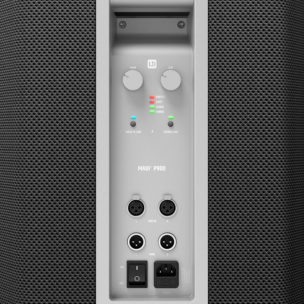 Constructed of high-strength aluminium with a multilayer mesh grille, the unique three-piece MAUI® P900 body features proprietary multi-pin connectors for instant cableless setup. The minimalist connector panel provides main and sub level controls plus XLR stereo line inputs and outputs for wired stereo operation of two systems.
