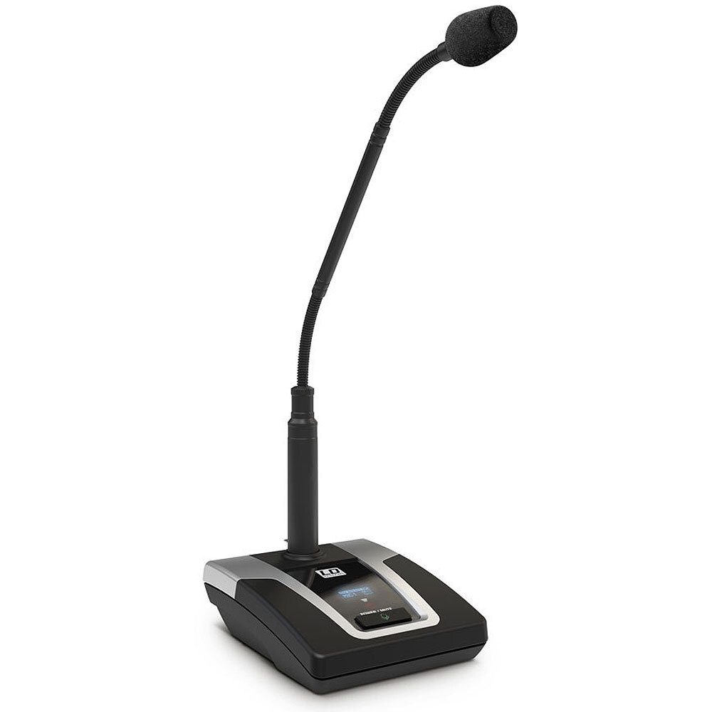 The U500® terminals feature a gooseneck condenser microphone with cardioid characteristic and a light ring to display status. The heavy table stand features an XLR microphone input, 28 V phantom power, an on-off-mute switch, as well as a gain control and a selectable 130 Hz high-pass filter to effectively reduce proximity effect and structure-borne sound. A high-contrast OLED display shows radio frequency, battery status, terminal number, group and channel. The audio transmission range is 60 Hz - 16 kHz.
