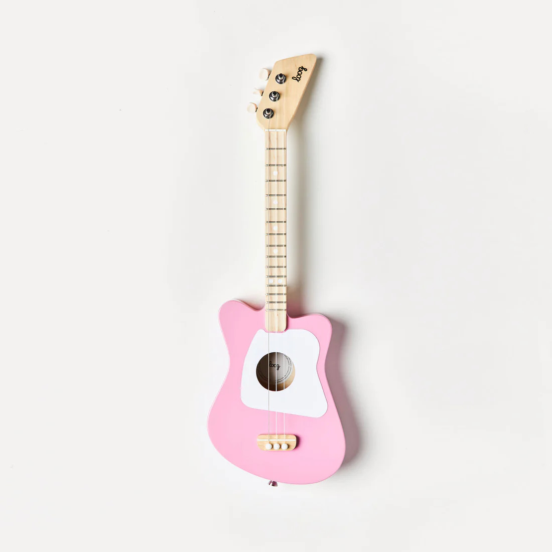 The Loog Mini Acoustic Guitar is the perfect first guitar for kids aged 3+. It's a tiny 3-string guitar, about the same size as a ukulele, and it's specially designed for small hands. The Loog Mini has classical guitar strings and standard guitar tuning, so kids can learn to play on it and then easily transition to any other guitar.