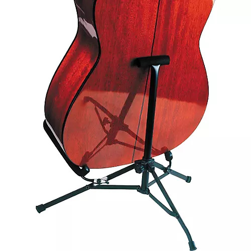 - This mini guitar stand for acoustic guitars folds to fit in most gig bags or cases and holds most standard-shaped guitars. Velveteen rubber protects your guitar's finish.