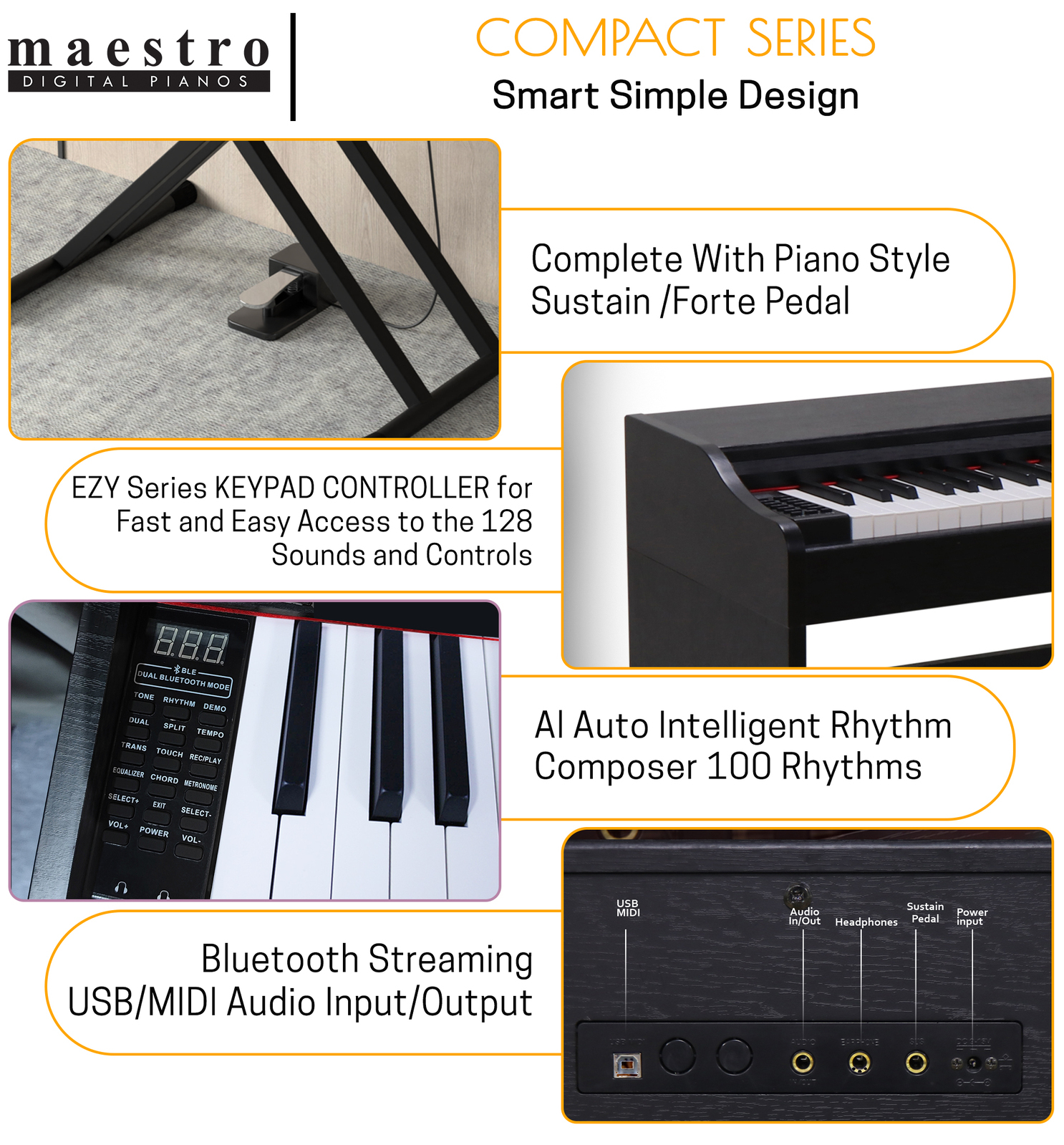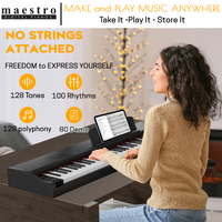 Maestro pianos provide great functionality and playability, giving students a pleasant experience beginning their musical journey in the world of playing, performing or composing - with a multitude of features: