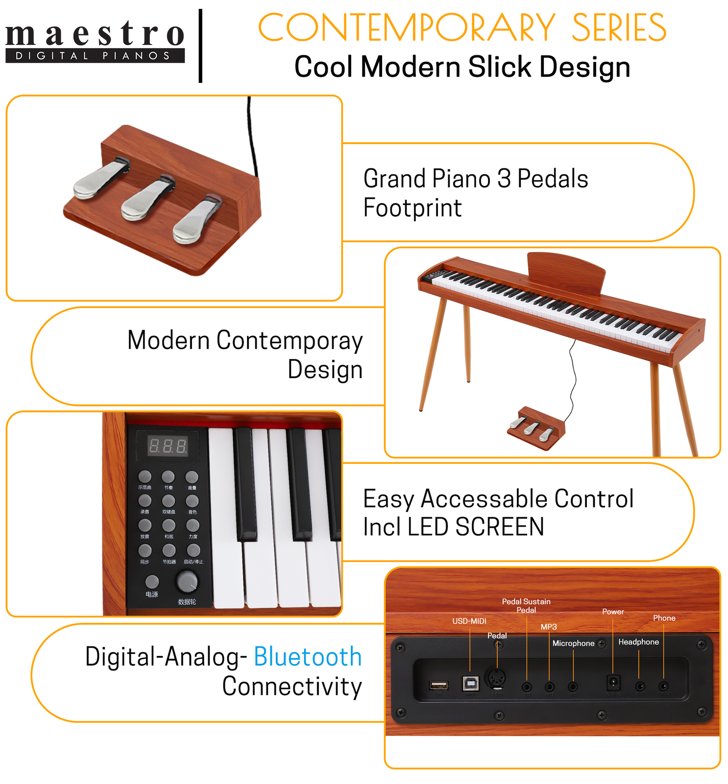 The Maestro MDP Series is the perfect addition to enhance your home or living environment. It is part of a family with an accent on American and European modern and classic design. This Piano can used in a desk situation or with a different selection of stands for a Modern and or Practical situation.
