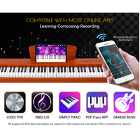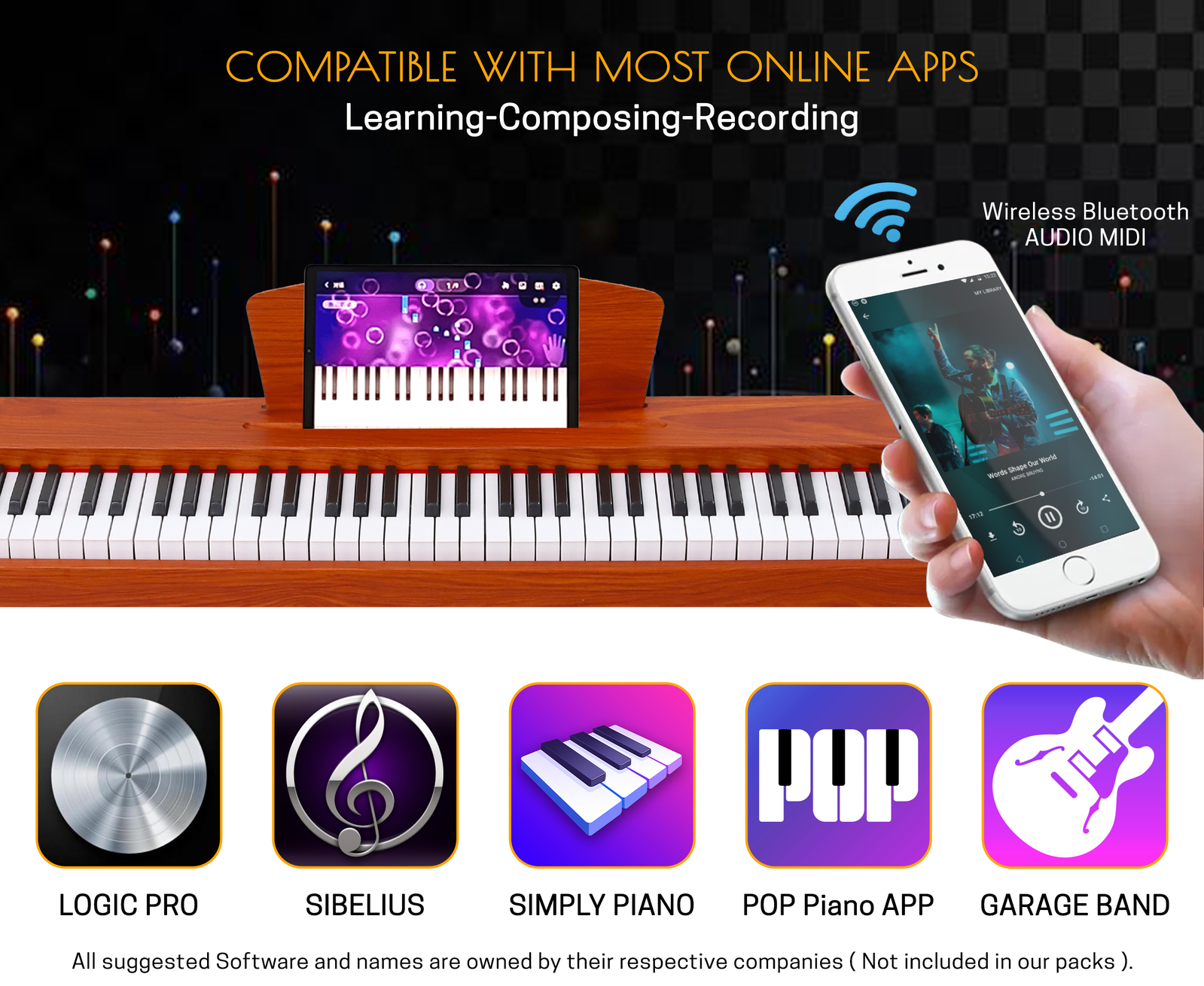 Great piano teaching apps are available so you can learn contemporary and classic songs at your own pace with videos or games. Piano Academy and Joy Tunes, for example, will allow you to dip your toes in the musical world of learning to play piano and begin your journey into a multimedia world of music. Remember that this piano will communicate and interact with MIDI Wirelessly.