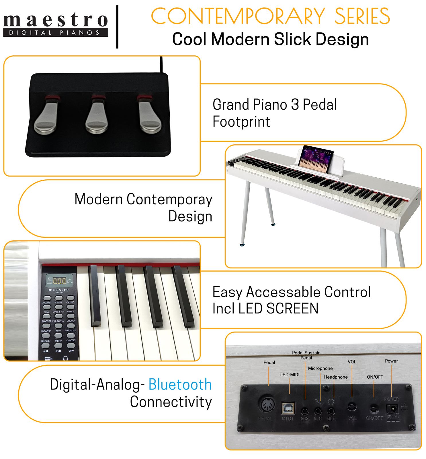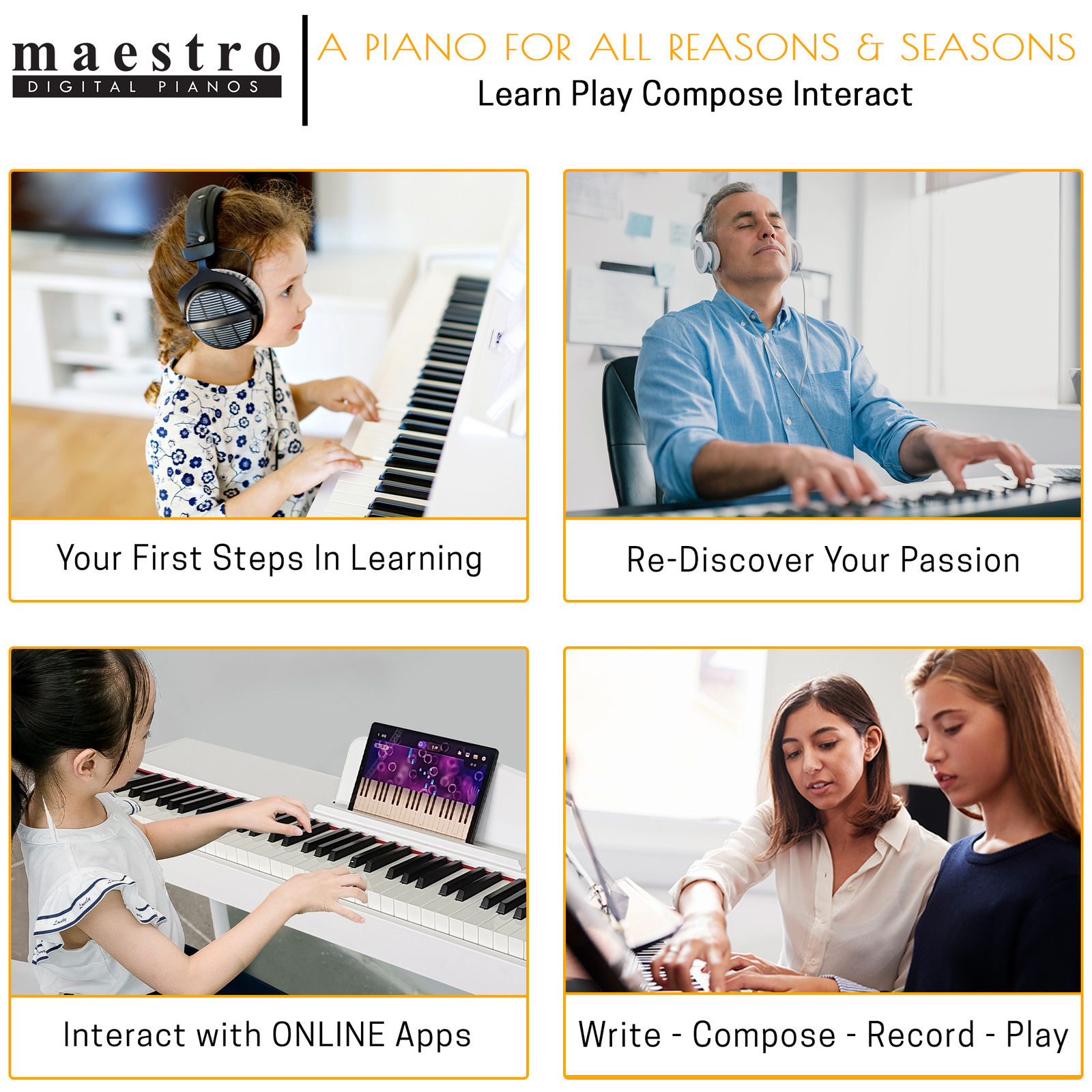 Maestro pianos provide great functionality and playability, giving students a pleasant experience beginning their musical journey in the world of playing, performing or composing - with a multitude of features as you will see below.