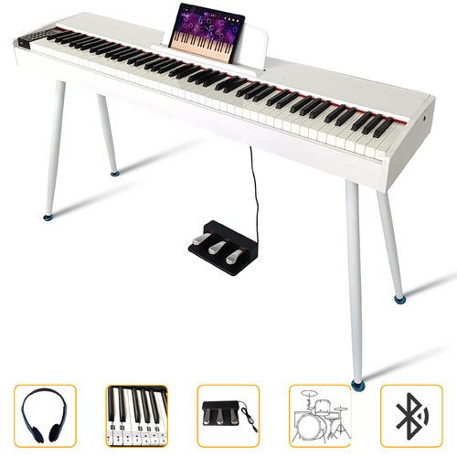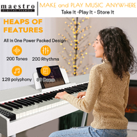 This modern-designed portable digital piano is the perfect piece to complement your home studio or living room. The new Maestro MDP200 portable series piano allows you to take your music anywhere. With bluetooth audio streaming ability, you can stream and play along to your music through the build-in speakers, wherever you go. The 128 instrument sounds and 80 rhythms follow you wherever you may choose to play and create music. The perfect compact and slimline solution to add the magic of music to your lounge room, studio or bedroom. It even has 60 built-in demo classical and modern pre-recorded piano pieces for you to listen or practice with. This is the perfect piano for the beginner student or hobbyist exploring the world or music at their fingertips.
