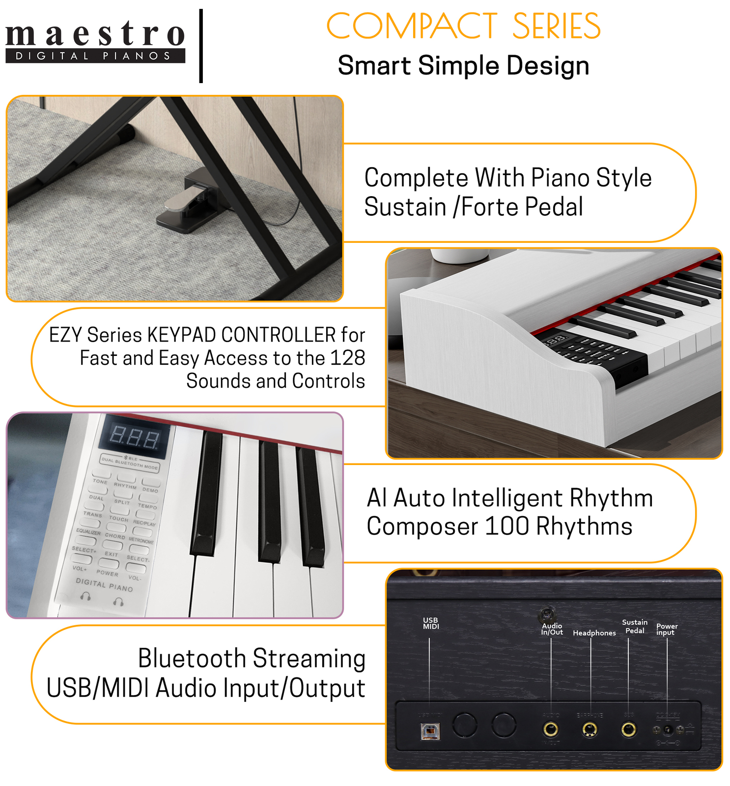 Maestro pianos provide great functionality and playability, giving students a pleasant experience beginning their musical journey in the world of playing, performing or composing - with a multitude of features as you will see below.