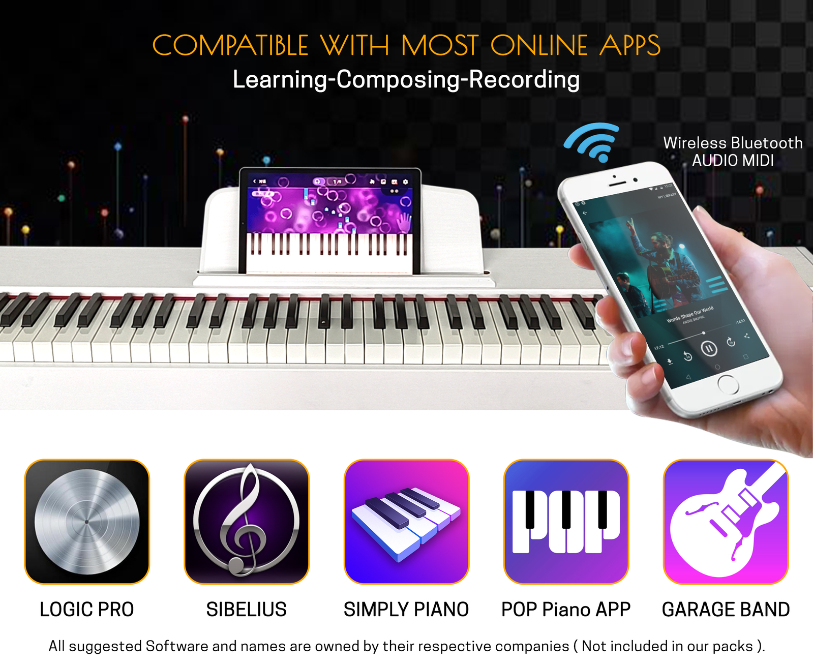 Great piano teaching apps are available so you can learn contemporary and classic songs at your own pace with videos or games. Piano Academy and Joy Tunes, for example, will allow you to dip your toes in the musical world of learning to play piano and begin your journey into a multimedia world of music. Remember that this piano will communicate and interact with MIDI Wirelessly.