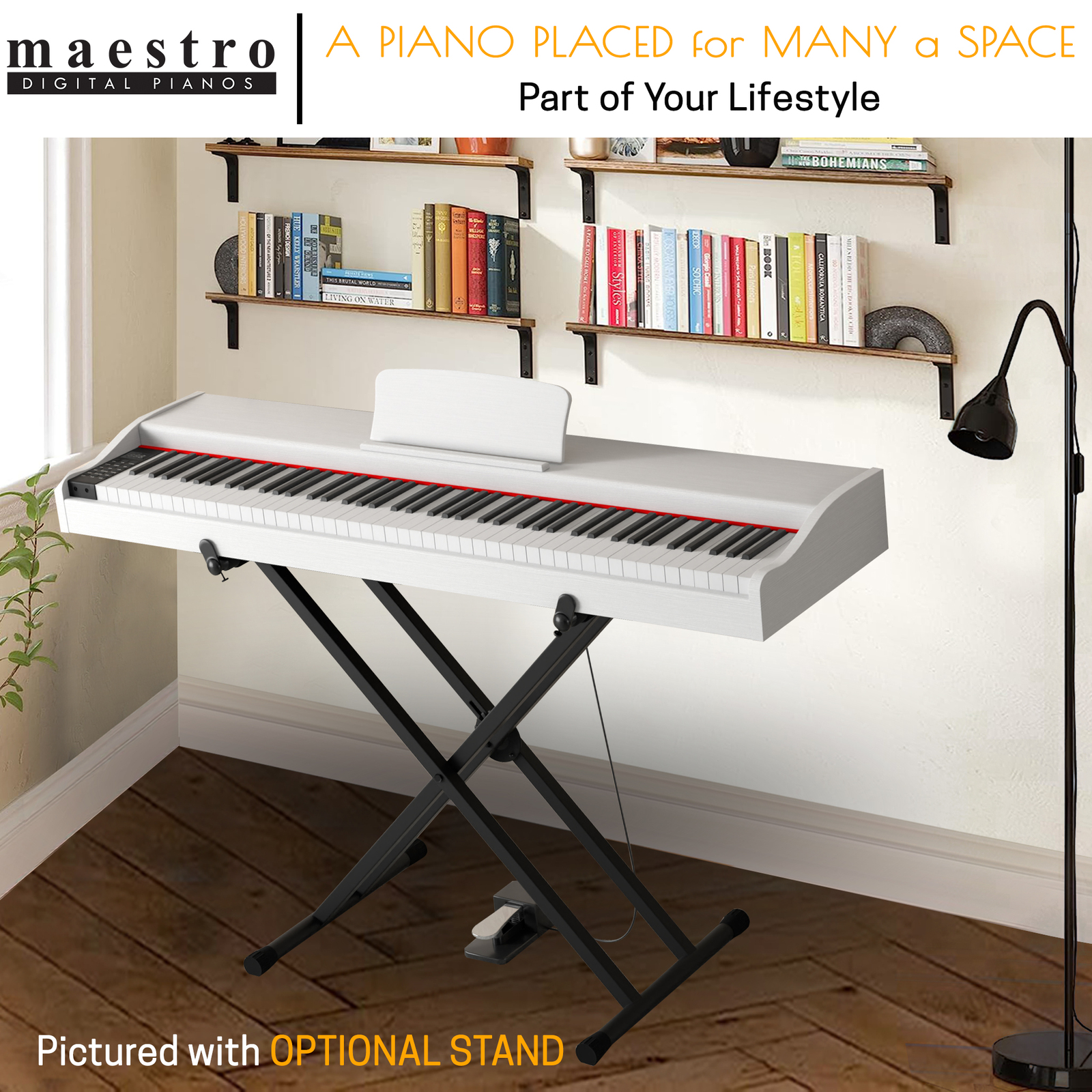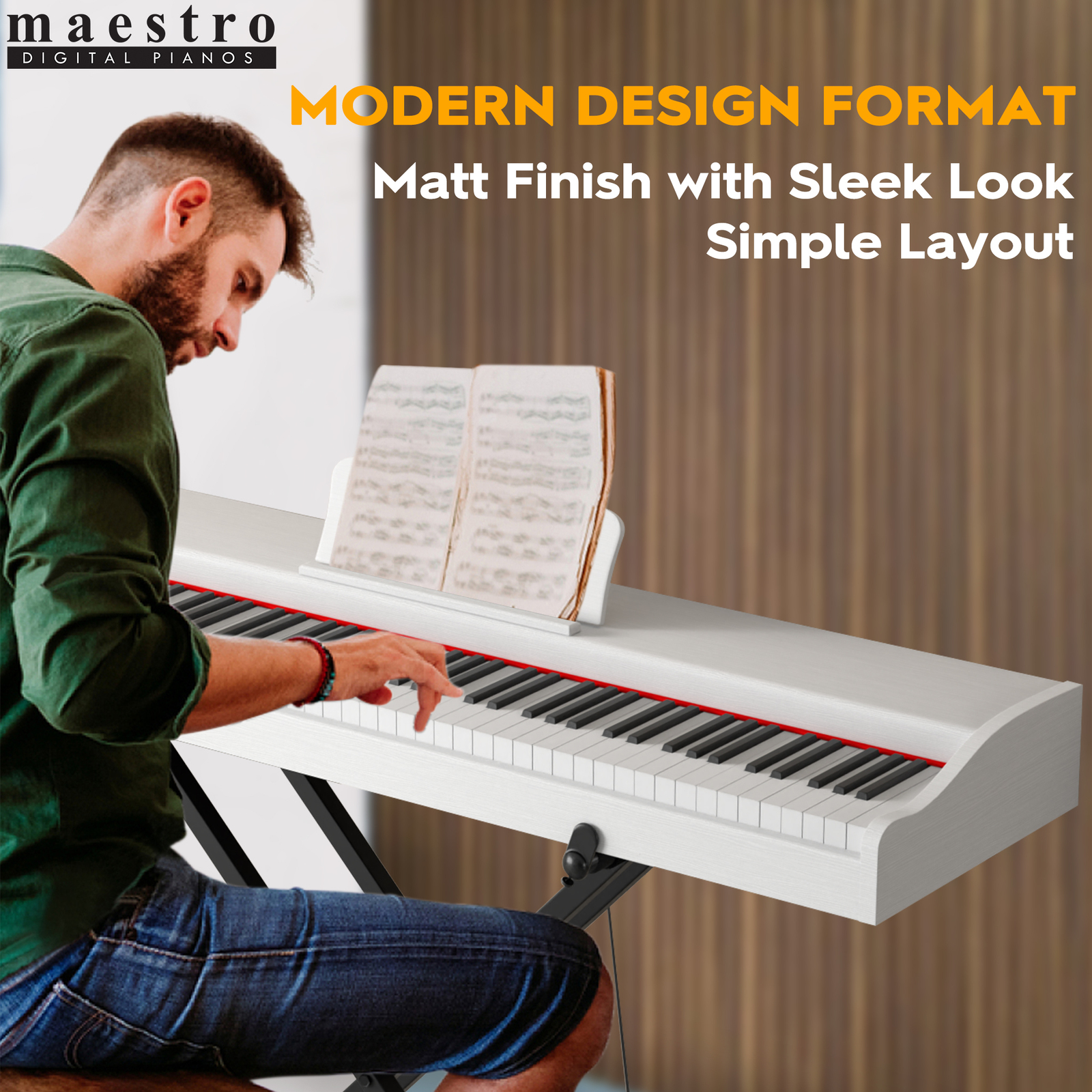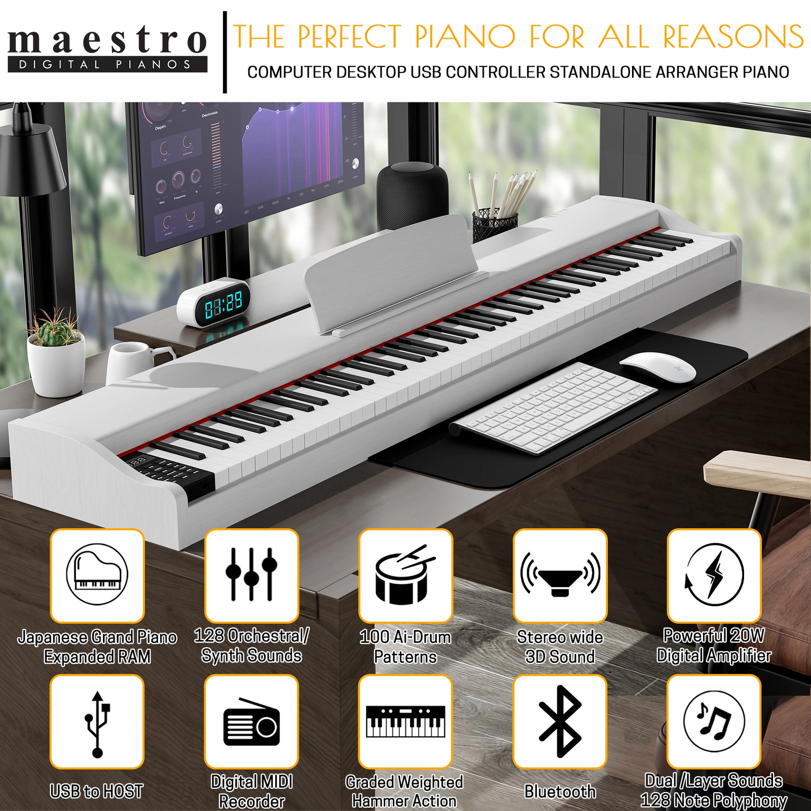 The Maestro MDP Series is the perfect addition to enhance your home or living environment. It is part of a family with an accent on American and European modern and classic design. This Piano can used in a desk situation or with a different selection of stands for a Modern and or Practical situation.