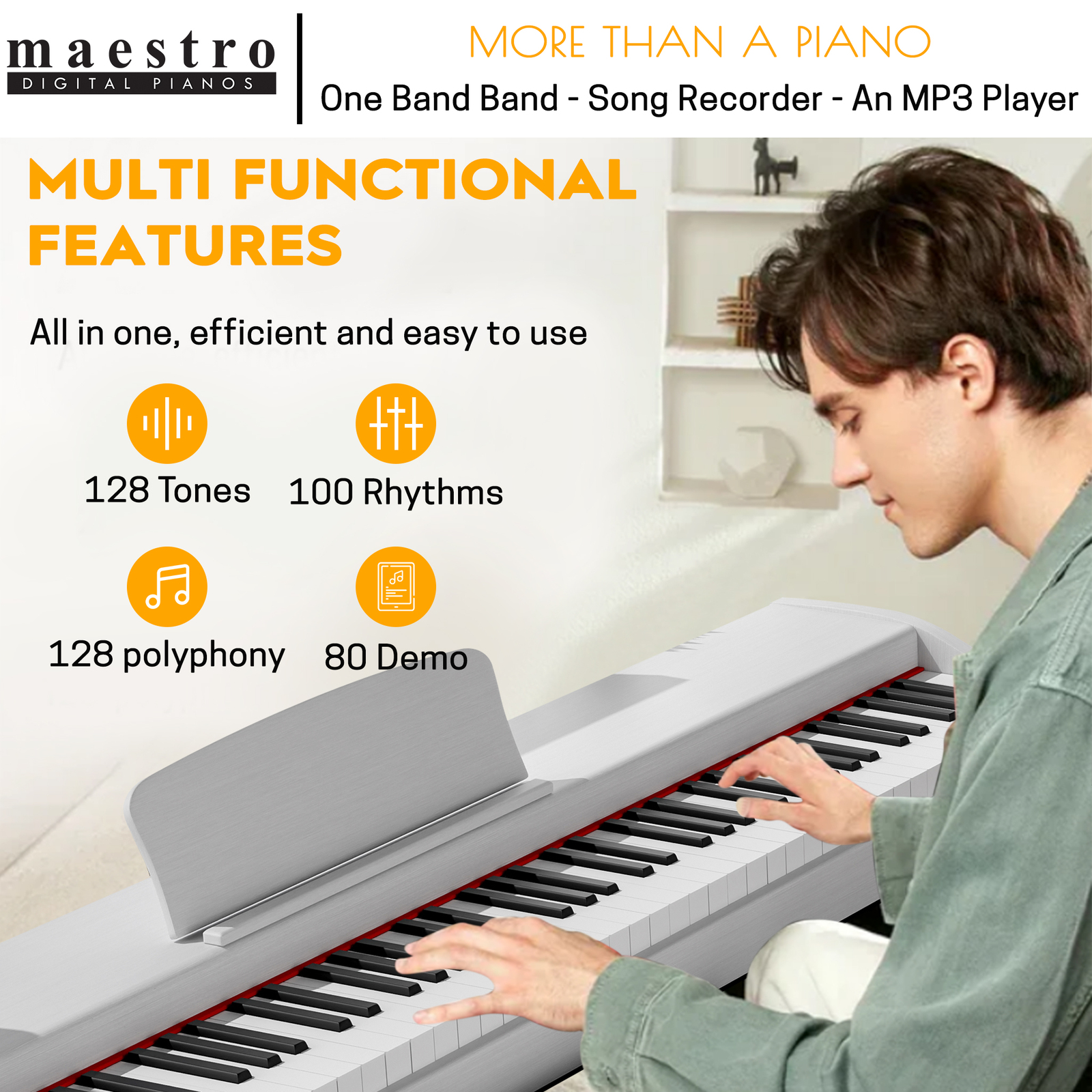 For the Singer Songwriter or Hobbyist, Maestro pianos come with single note Advanced Intelli-Chord function. It will follow your chords so that can also feel what it's like to play with a band and sound like a pro with a built-in drums, bass, guitar and other band instruments.