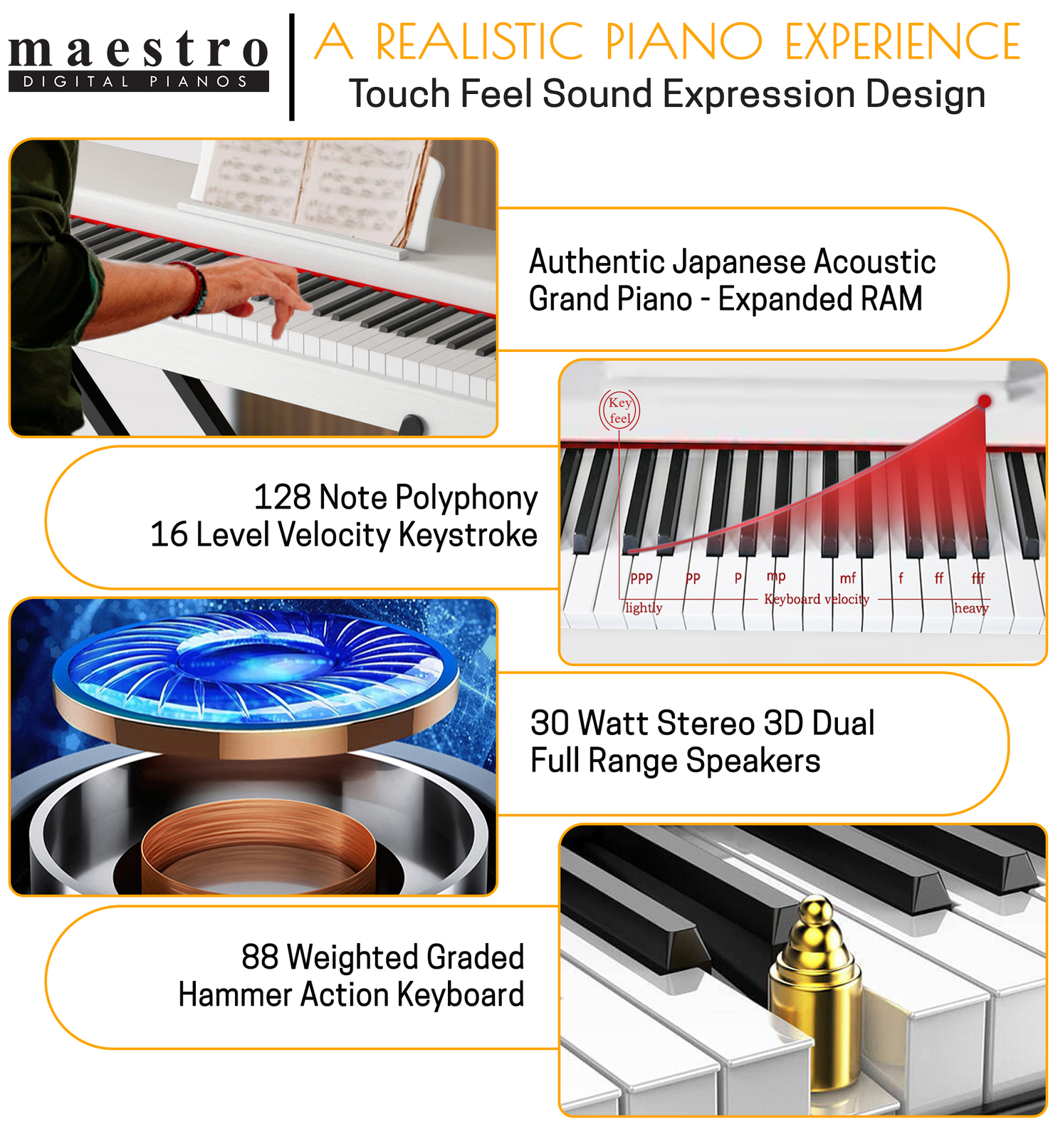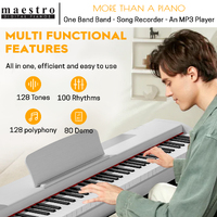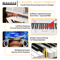 Maestro pianos provide great functionality and playability, giving students a pleasant experience beginning their musical journey in the world of playing, performing or composing - with a multitude of features as you will see below.