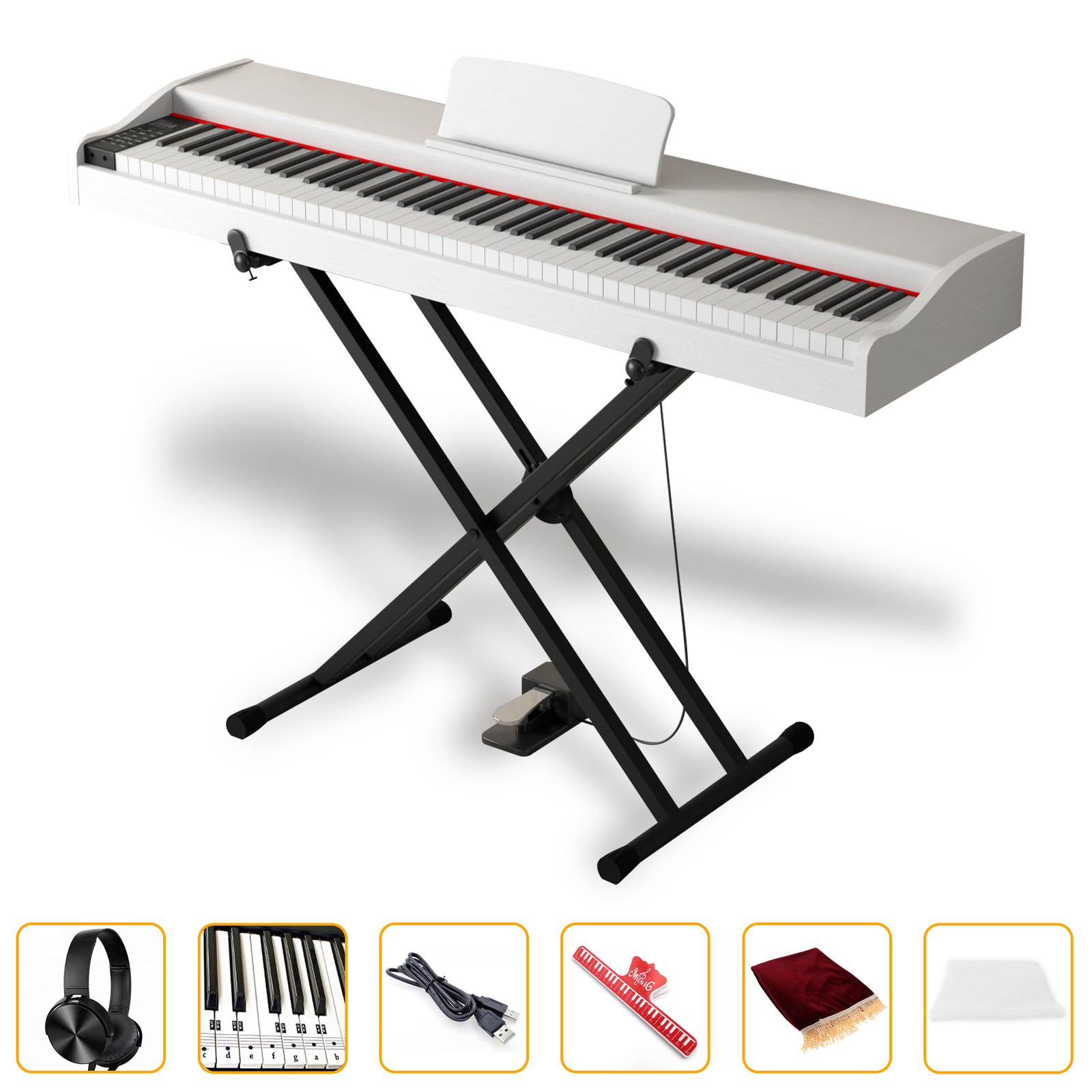Headphones - USB Cable - Sheet Music Clip - Key Polish Cloth - Fox Fur Style Dust Cover - All included to make your buying experience an even more exciting and better value purchase so that you can better enjoy and also can protect your investment.