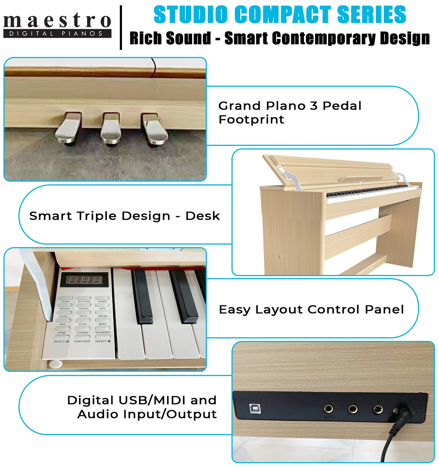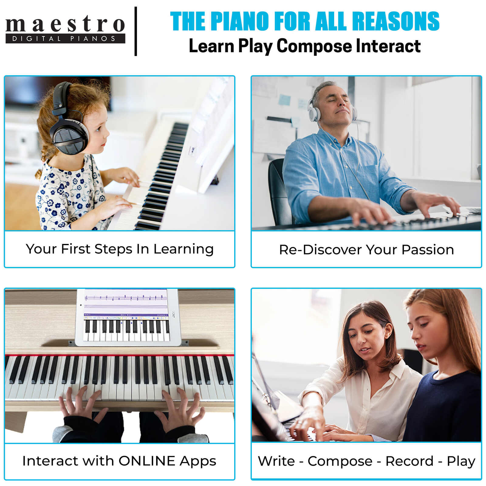 Maestro pianos provide great functionality and playability, giving students a pleasant experience beginning their musical journey in the world of playing, performing or composing - with a multitude of features as you will see below.