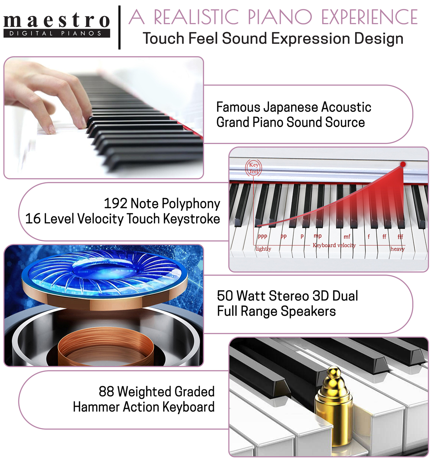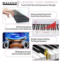 The European Sound Design team of the Maestro Hammer Action Digital Piano has combined the Rich Sound of a Japanese Grand Piano, a build in Intelli-Arranger with Recording & Bluetooth into one of the best value package piano in Australia.