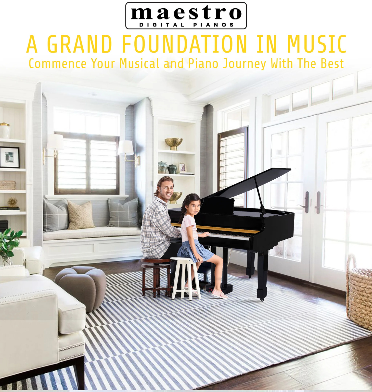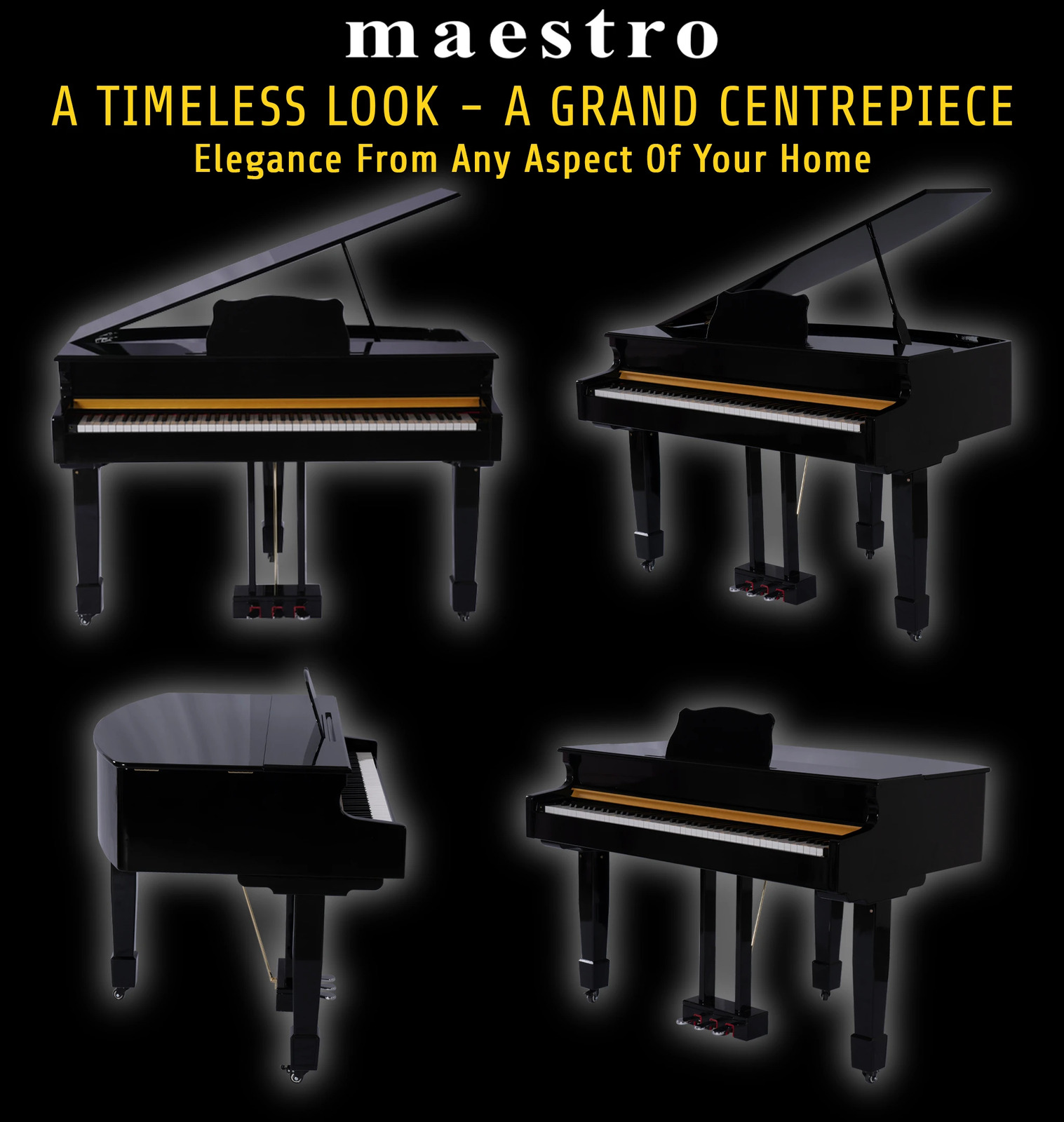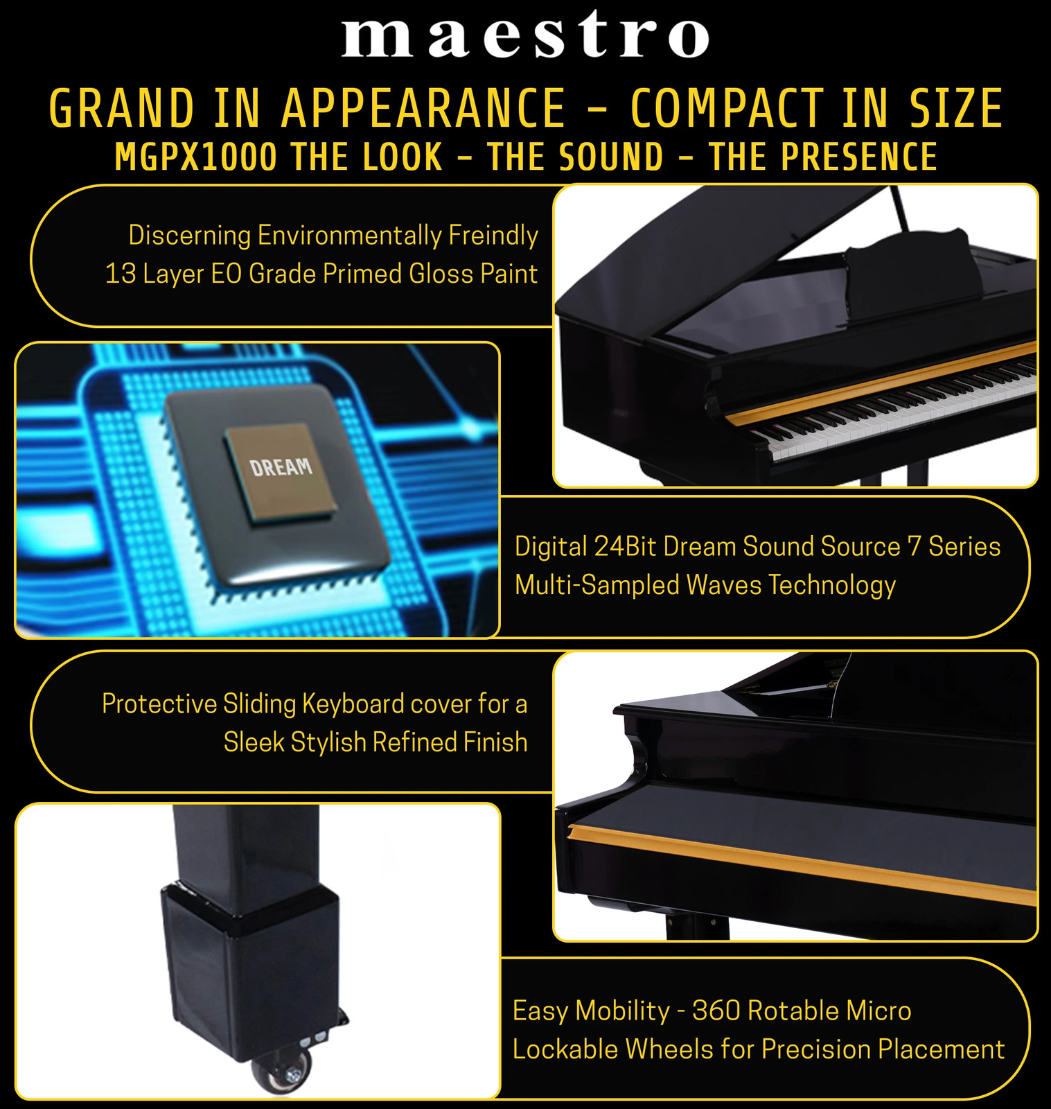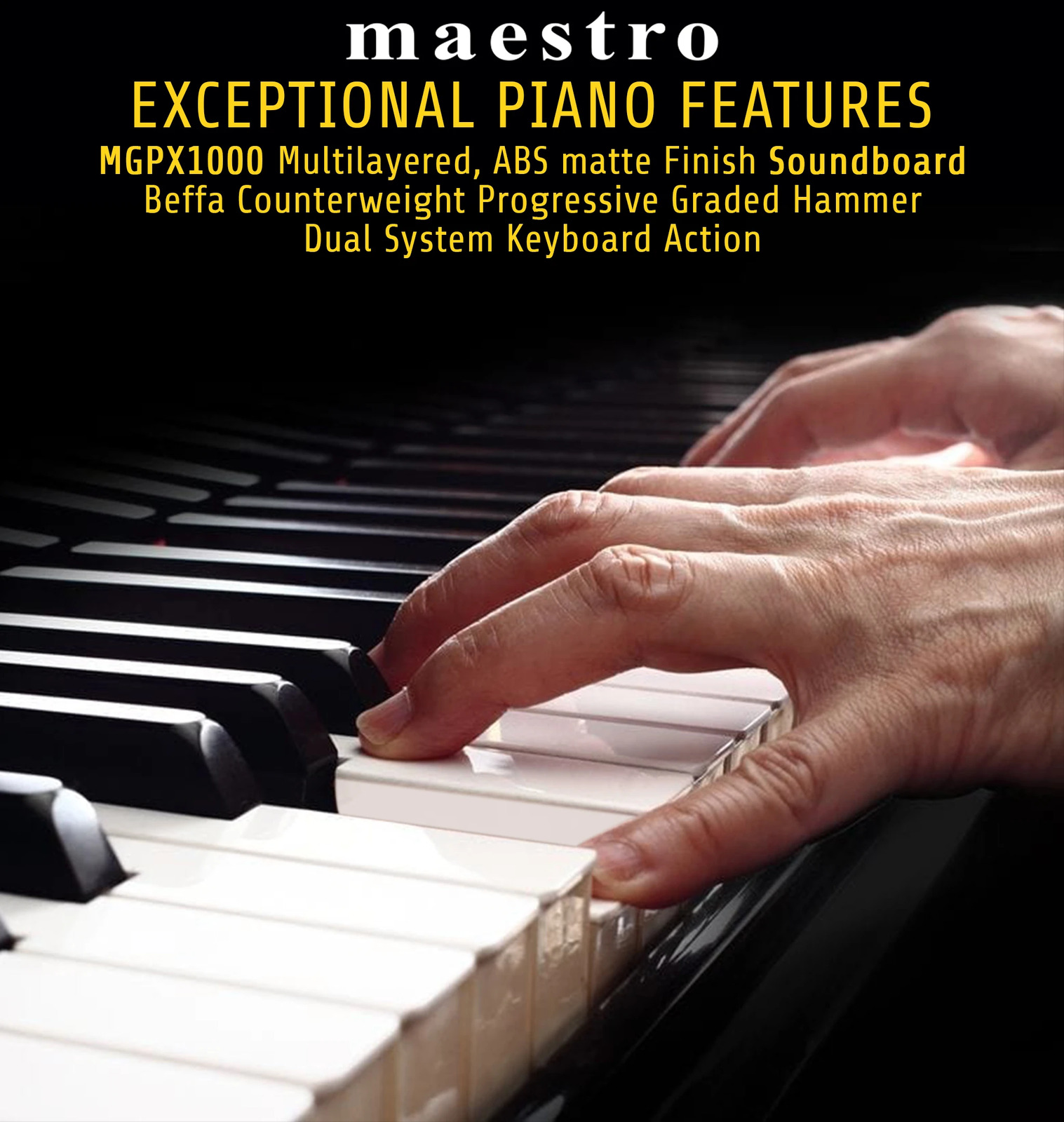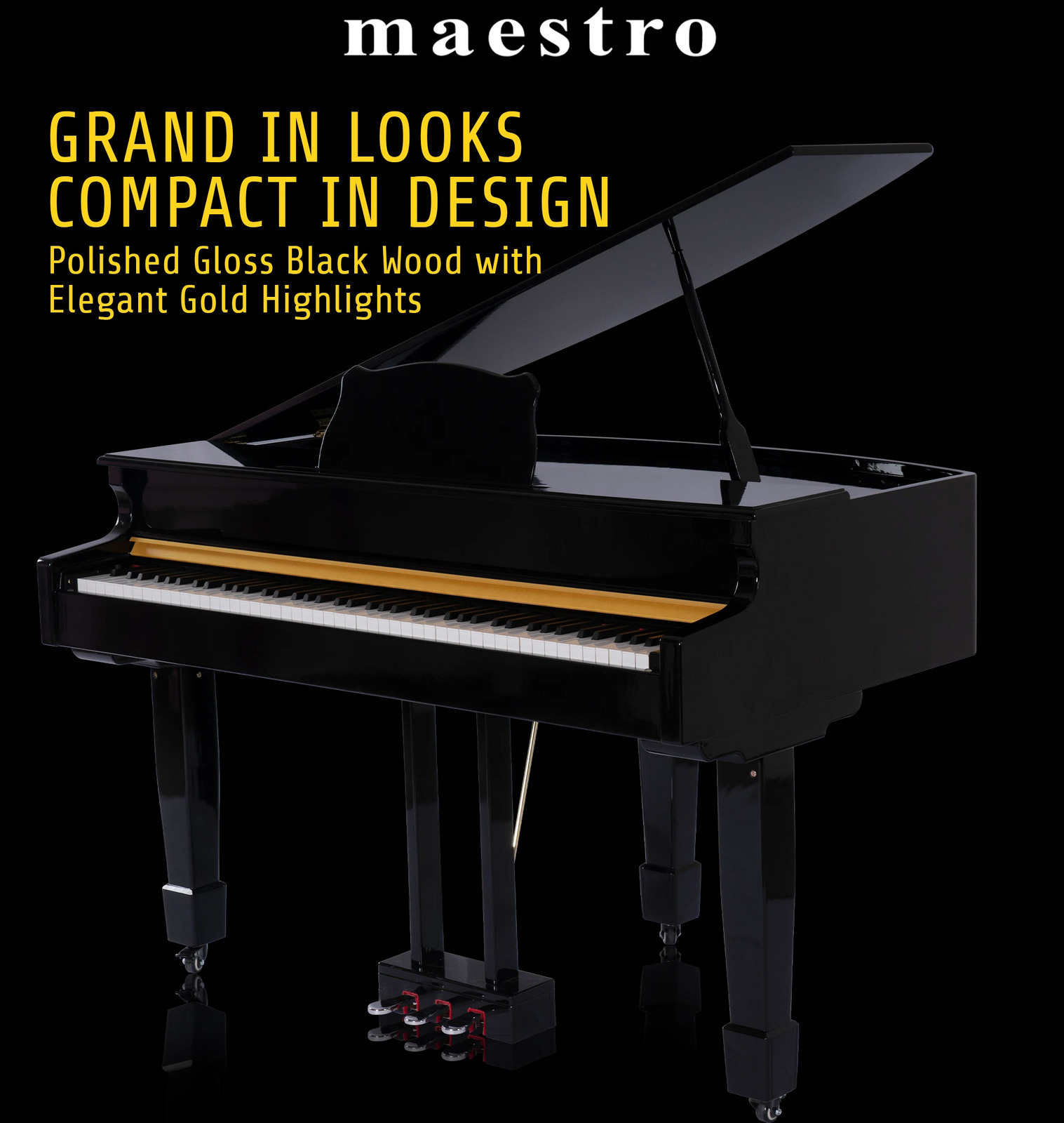 The MAESTRO MGP1000 Series combines an elegant compact Baby Grand Piano design with exquisite polished ebony cabinet and a modern leg design. The classic three leg corinthian style design for perfect balance combined with the three-pedal foot print allows it to look and perform similar to the traditional grand piano. It also has 88 graded hammer action keys which helps to recreate a similar feel and touch of grand piano making it heavier at the bottom and faster return at the top.