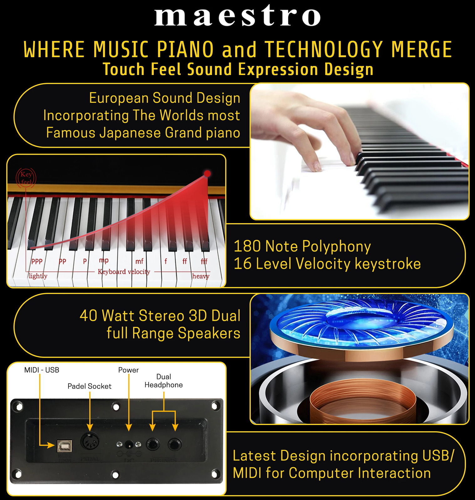 Digital Connectivity The MAESTRO MGP1000 features a USB input and cable for an easy, driverless computer connection. Switch on the MDP1000 and it instantly calls up the grand piano voice. With the USB interface, you can connect seamlessly to your computer and use the 88-weighted piano keyboard as a controller for your software, opening up endless possibilities for sounds and voices in your digital sound library.