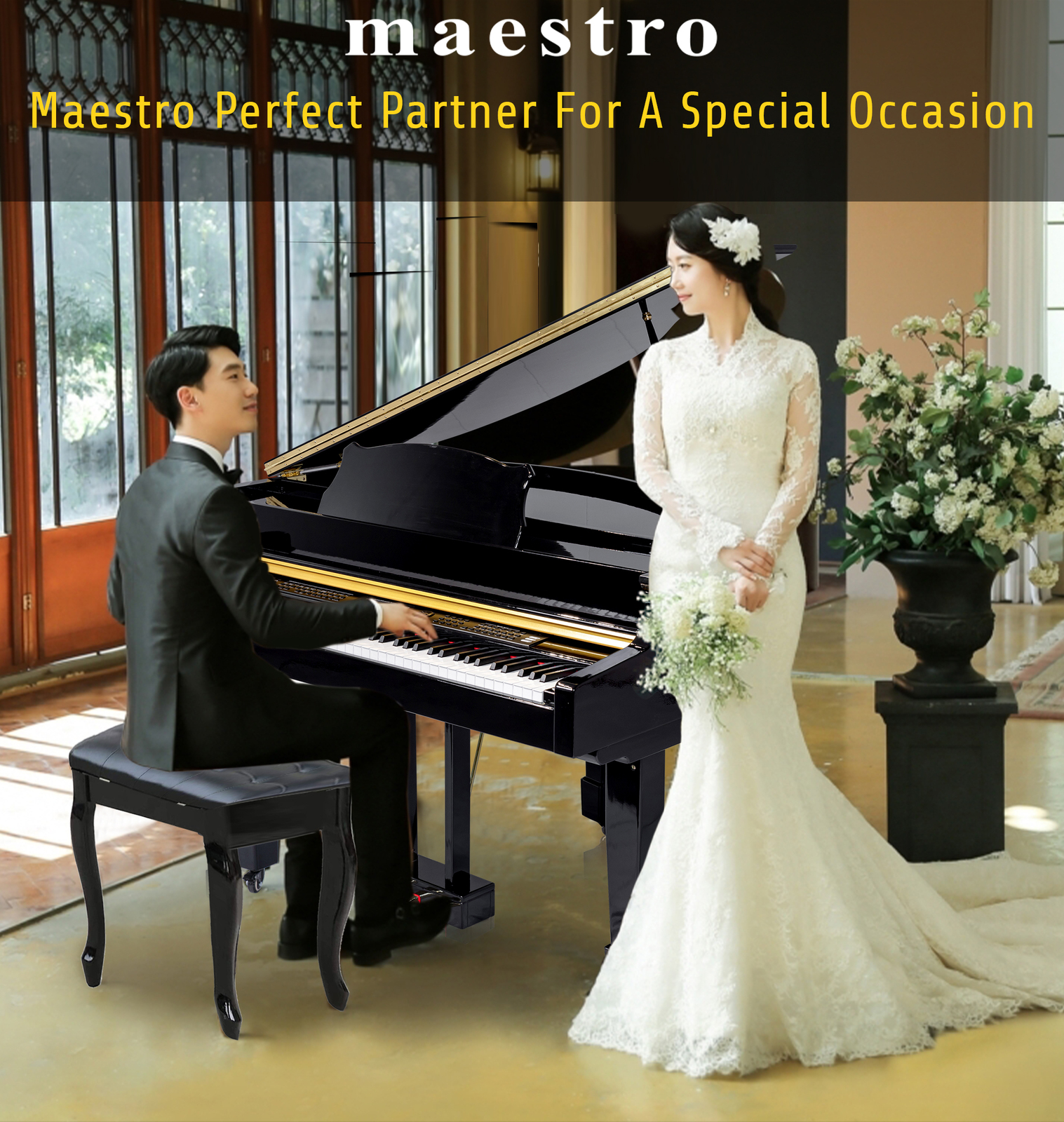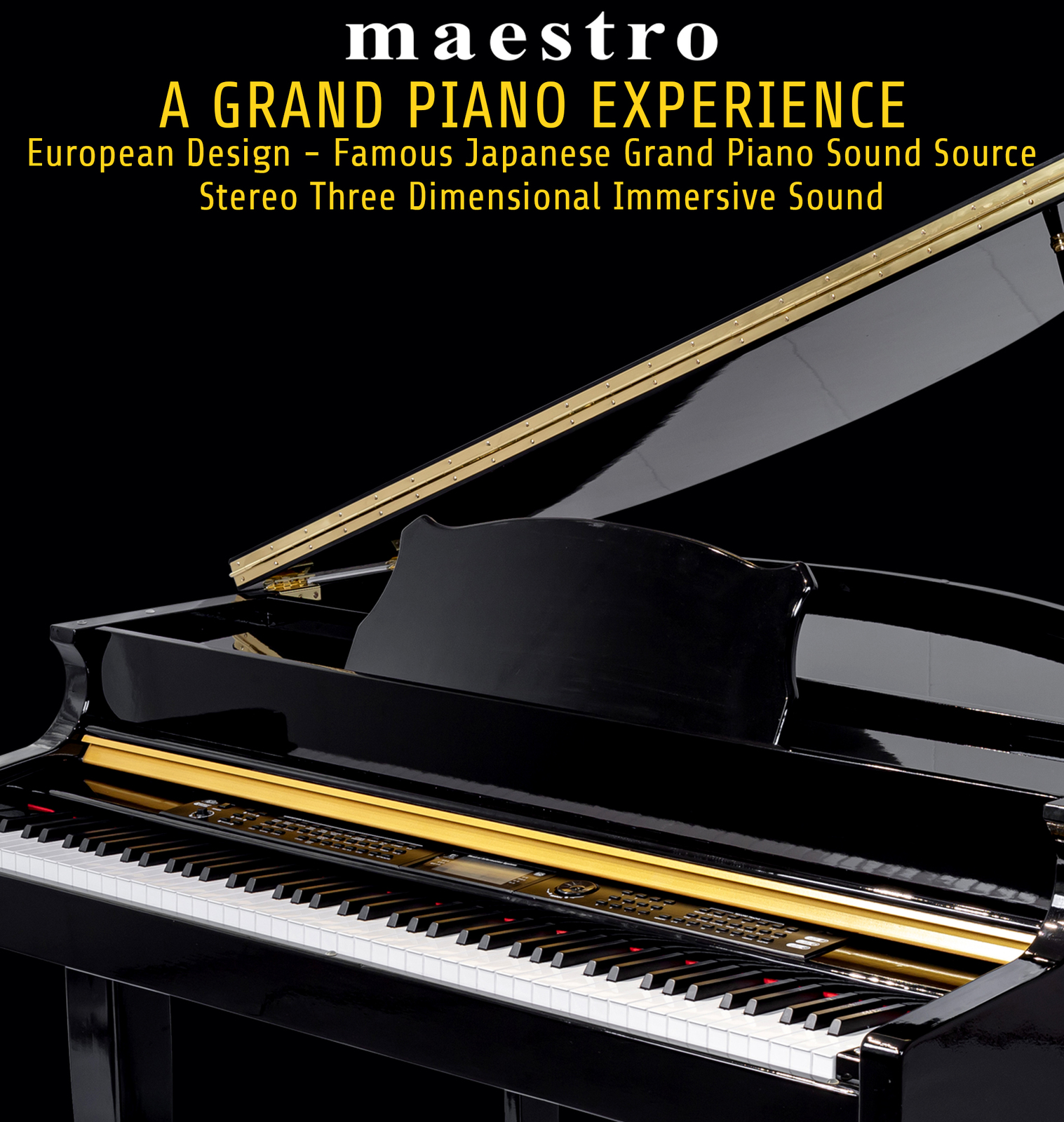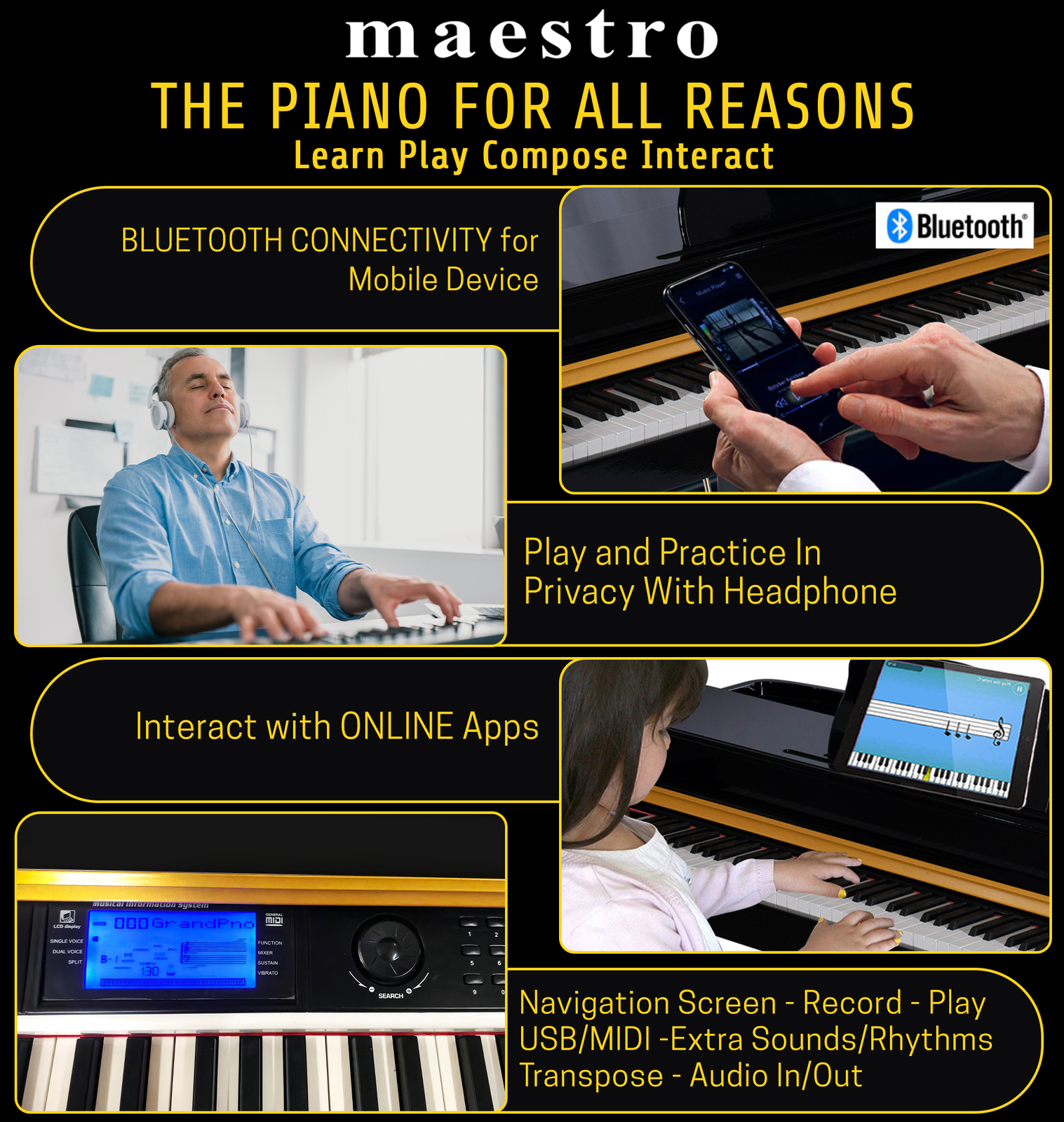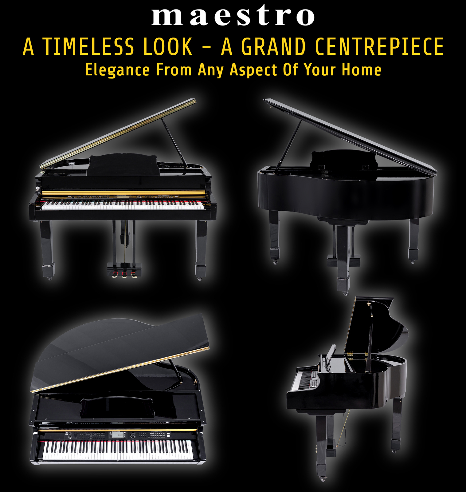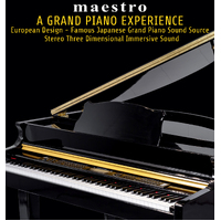 The MAESTRO DIGITAL BABY GRAND combines an elegant compact grand piano design with exquisite polished ebony cabinet and a modern leg design with the latest in Digital Sound source AUDIO DESIGN