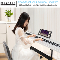 The Maestro Touch Sensitive Semi-Weighted Keyboard strikes a great balance between an 88-Note piano and keyboard, combining the correct size of the piano keys with the touch, feel, and features of a keyboard. It has a built-in self-paced teaching system and comes with our best starter package which includes a height-adjustable stand, karaoke microphone, key guide stickers and USB connection for a wide choice of suitable apps making this a great starter package at a great price, perfect as a first 88-note keyboard for the young beginner or budding pianist venturing into the world of piano or keyboard playing.