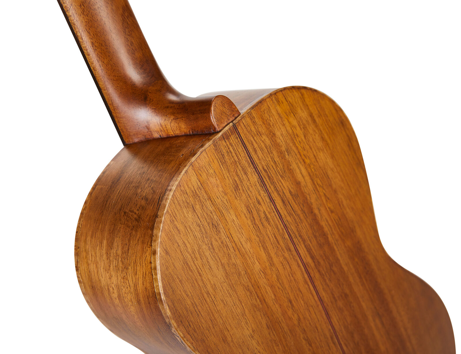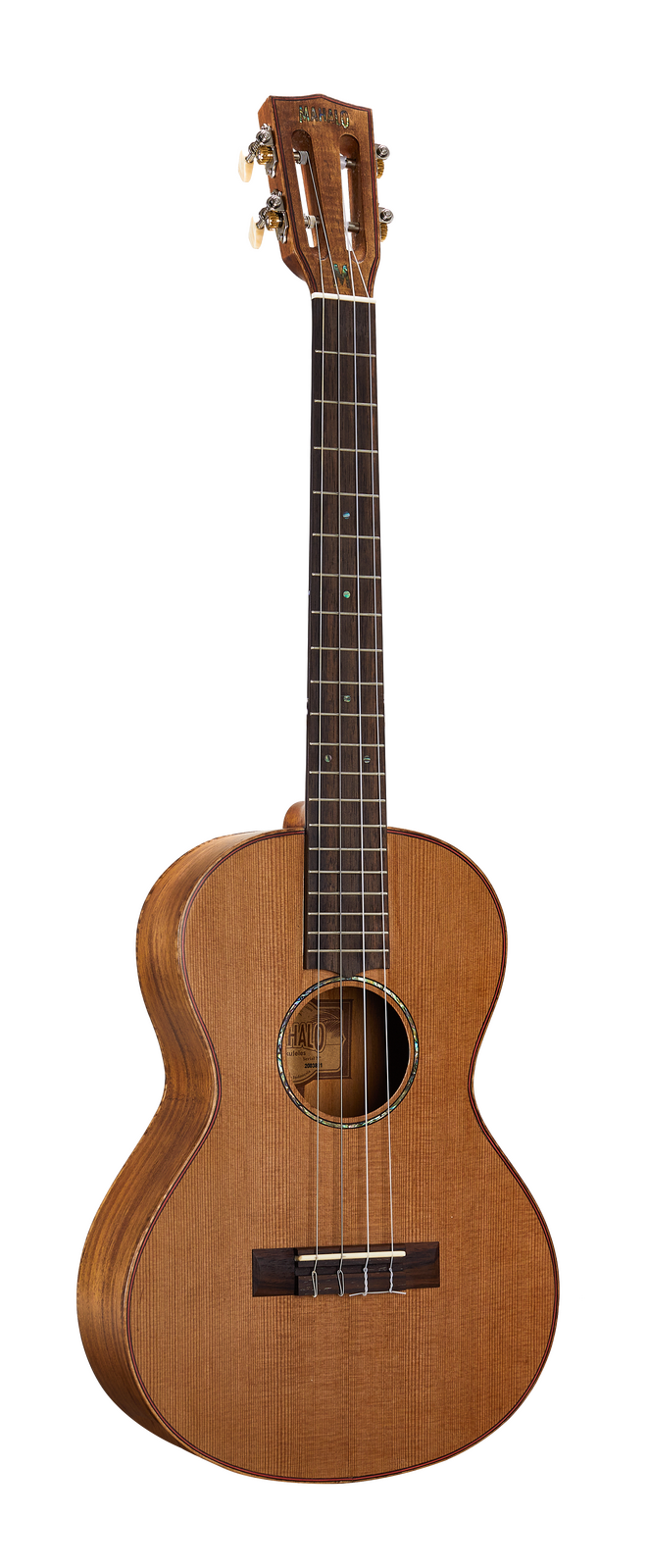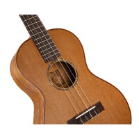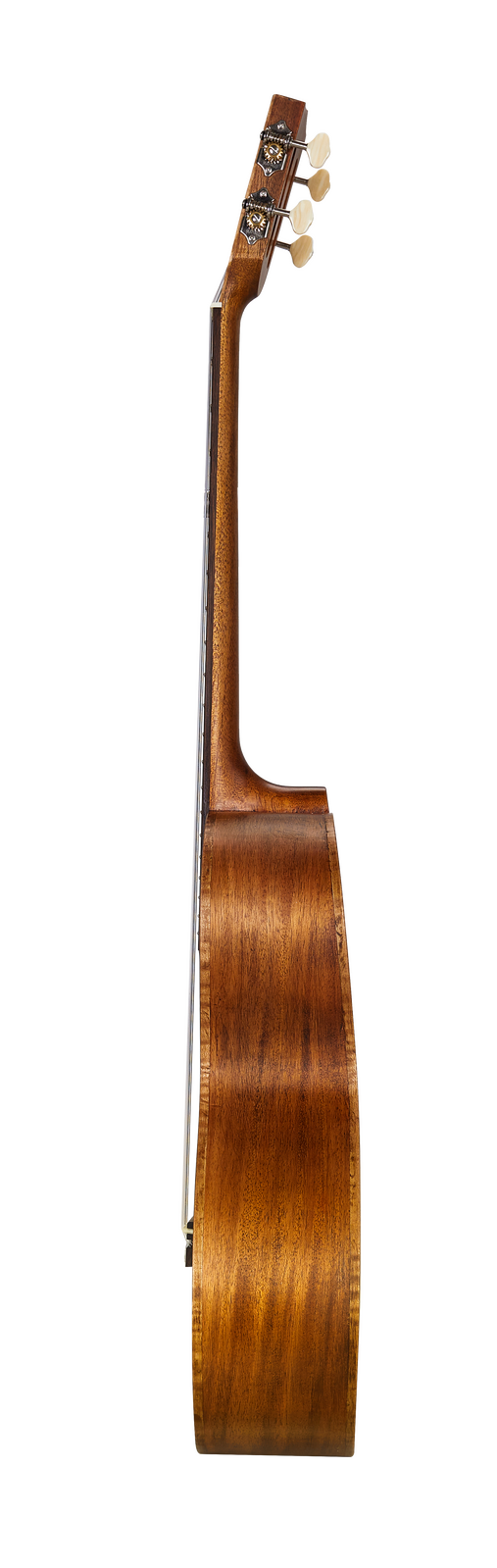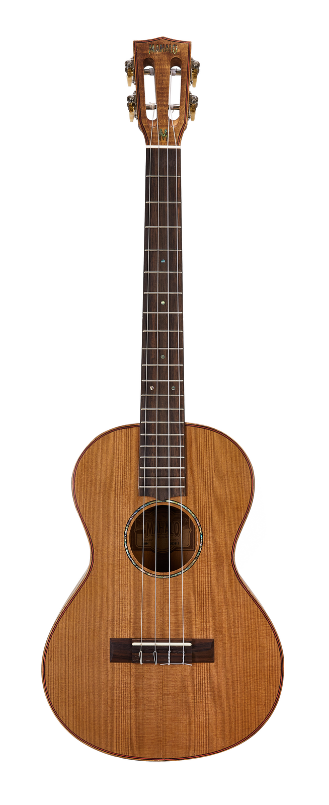 Hand-made, solid red cedar top with solid mahogany back and sides. Arched back with centre back strip. Flamed maple side binding with 3 ply multi-layer wood top binding. One piece mahogany neck. Amara ebony fingerboard with abalone dot inlaid position markers. Slotted headstock with flamed maple veneer and inlaid abalone Mahalo logos and 3 ply multi-layer wood binding. Inlaid abalone soundhole rosette. Amara ebony bridge. Bone nut and saddle. Unique ToneFlow bracing. High quality Taiwanese nickel plated Waverley style machine heads with ivoroid buttons. Aquila Super Nylgut strings. 20 nickel frets.