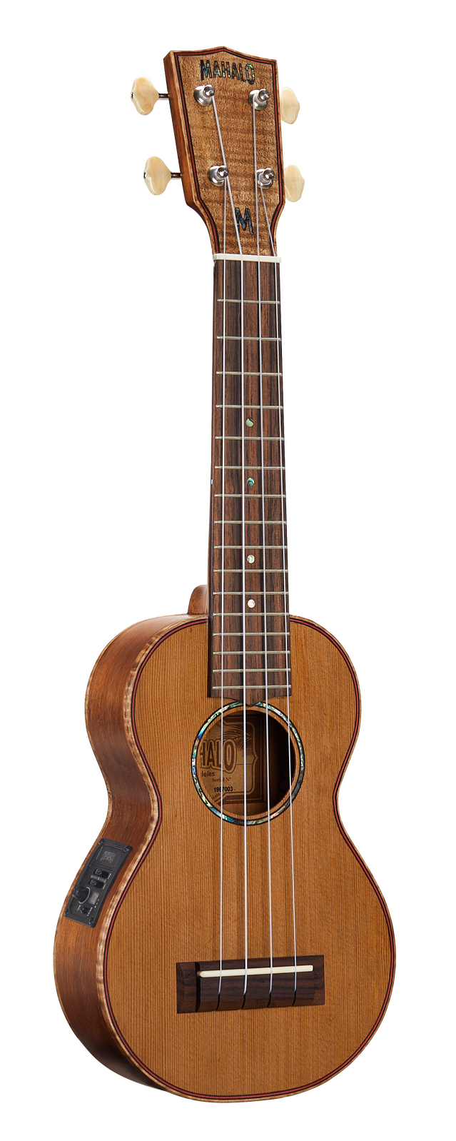 Hand-made, solid red cedar top with solid mahogany back and sides. Arched back with centre back strip. Flamed maple side binding with 3 ply multi-layer wood top binding. One piece mahogany neck. Amara ebony fingerboard with abalone dot inlaid position markers. Traditional headstock with flamed maple veneer and inlaid abalone Mahalo logos and 3 ply multi-layer wood binding. Inlaid abalone soundhole rosette. Amara ebony bridge. Bone nut and saddle. Unique ToneFlow bracing. High quality Taiwanese nickel plated Waverley style machine heads with ivoroid buttons. Aquila Super Nylgut strings. 12 nickel frets. Fitted with piezo under-saddle pickup and Mahalo MEQ2 onboard pre-amp with 2-band EQ and built in LCD tuner.