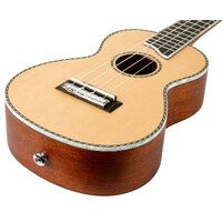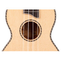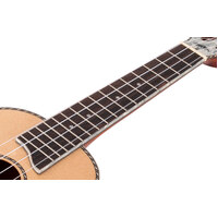 Our master luthiers are committed to producing finely handcrafted instruments with an artistic edge, and the PEARL SERIES is the result of this commitment. We are proud to introduce this series to players around the world seeking professional-grade instruments with a unique look and sound. Our Sitka spruce tops provide precise clarity and incredible dynamic response while mahogany bodies add sustain and warmth to the tone. A smooth mahogany neck with ebony fingerboard offers amazing response and smooth playability across the entire surface of the neck. A genuine ebony bridge and Graph Tech NuBone XB saddle add to the resonance and durability of this magnificent instrument. To match these premium specifications, PEARL SERIES instruments feature skilfully crafted pearloid veneers and wood inlays all around the headstock, neck, body and bridge to add a uniquely sophisticated touch. SPECIFICATIONS TOP: Solid Sitka Spruce BODY: Mahogany with Arched Back TOP BINDING: Pearloid, 3 ply black/white binding with wood rope inlaid purfling HEADSTOCK VENEER: Pearloid, 3 ply black/white with wood Rope inlaid binding and Palm motif FINGERBOARD: Ebony with wave shaped end detail NECK: Mahogany NECK BINDING: Pearloid, 3 ply black/white POSITION MARKERS: Inlaid Celluloid NECK SIDE DOTS: Yes NECK HEEL: Pearloid, 3 ply black/white cap with Palm motif FRETS: 16, Nickel BRIDGE: Ebony TIE BLOCK MOSAIC: Pearloid, with wood Rope inlaid binding TOP NUT: ABS, White BRIDGE SADDLE: Graph Tech NuBone XB ROSETTE DECORATION: Wood Rope inlaid. MACHINE HEADS: Vintage, Nickel Plated with Cream buttons STRAP BUTTON: Nickel STRINGS: Aquila, Super Nylgut SCALE LENGTH: Concert: 379mm NUT WIDTH: 35mm FINISH: Matt Heavy Duty Carry Bag with Shoulder Strap Included