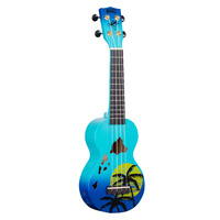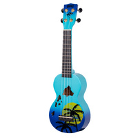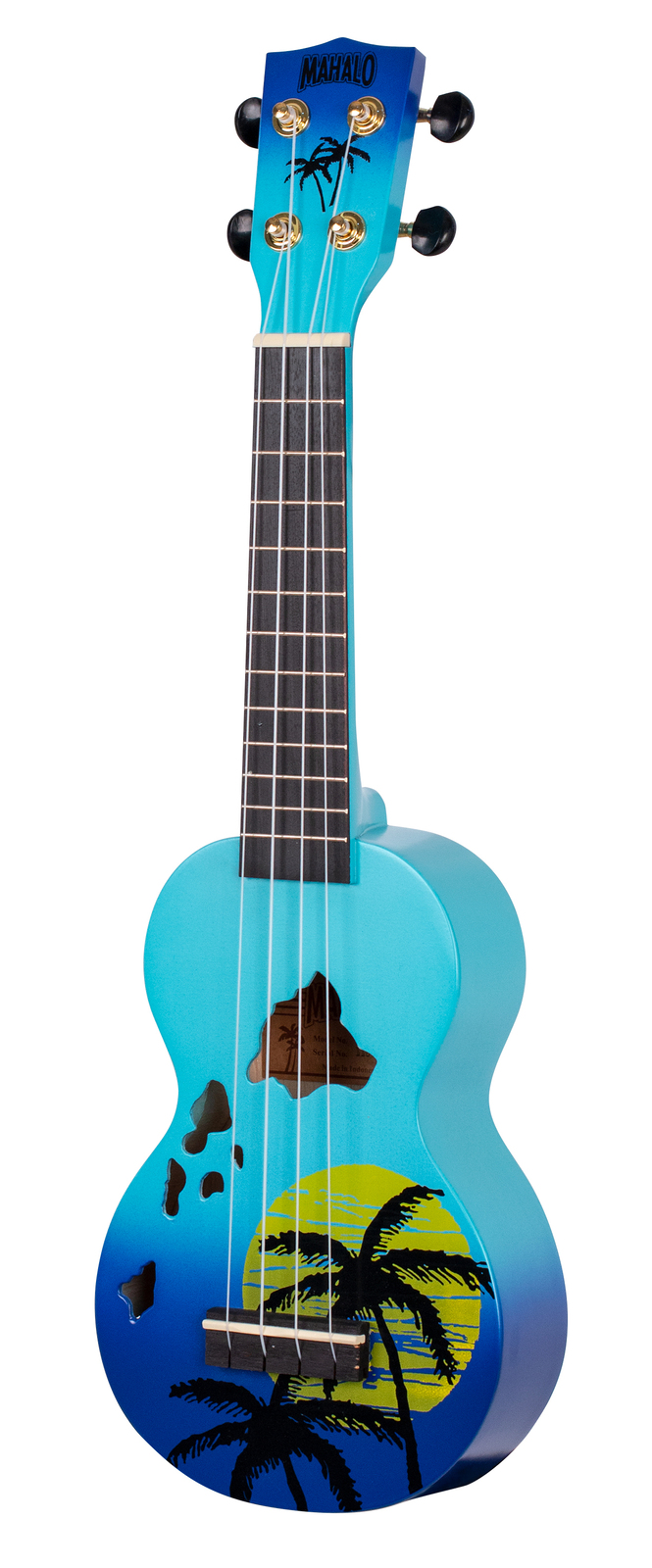 The Mahalo Designer Series consists of screen printed graphics and unique shaped soundholes. The Series pays tribute to Hawaii, where the Ukulele orginated from. Available in astounding sunburst colours, featuring beautiful sunset palm tree motif and soundholes in the shape of the Hawai'ian islands.