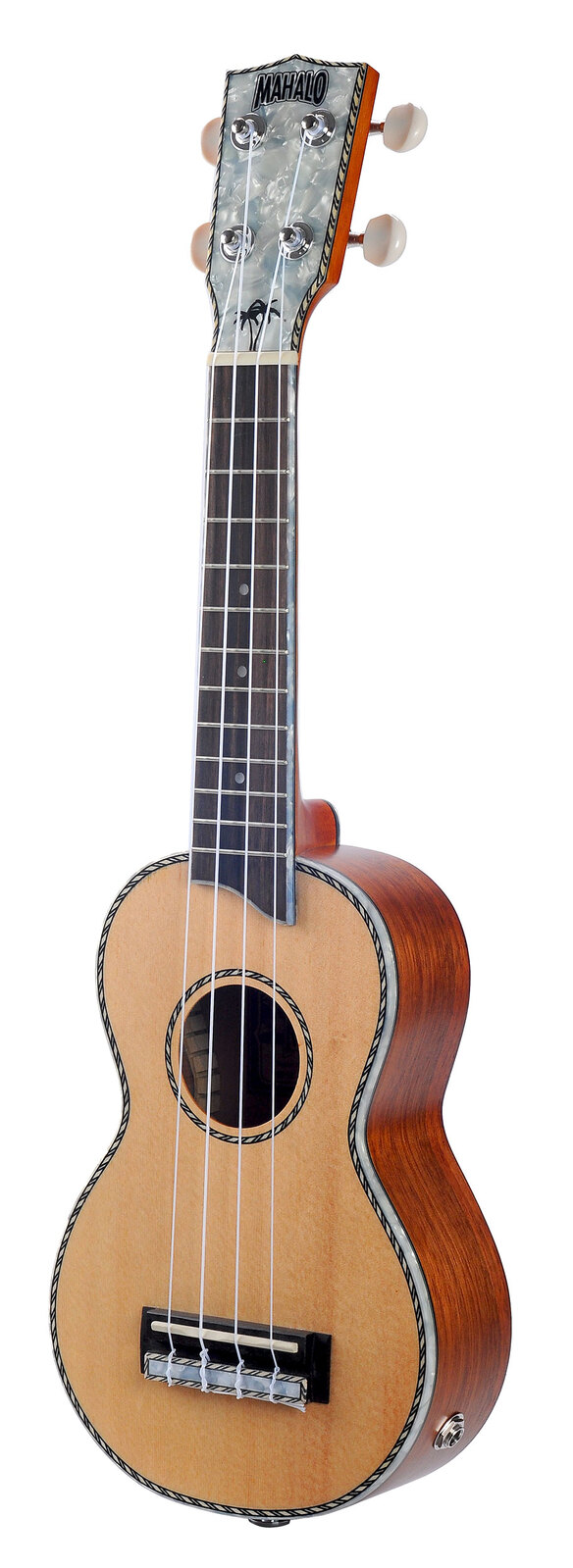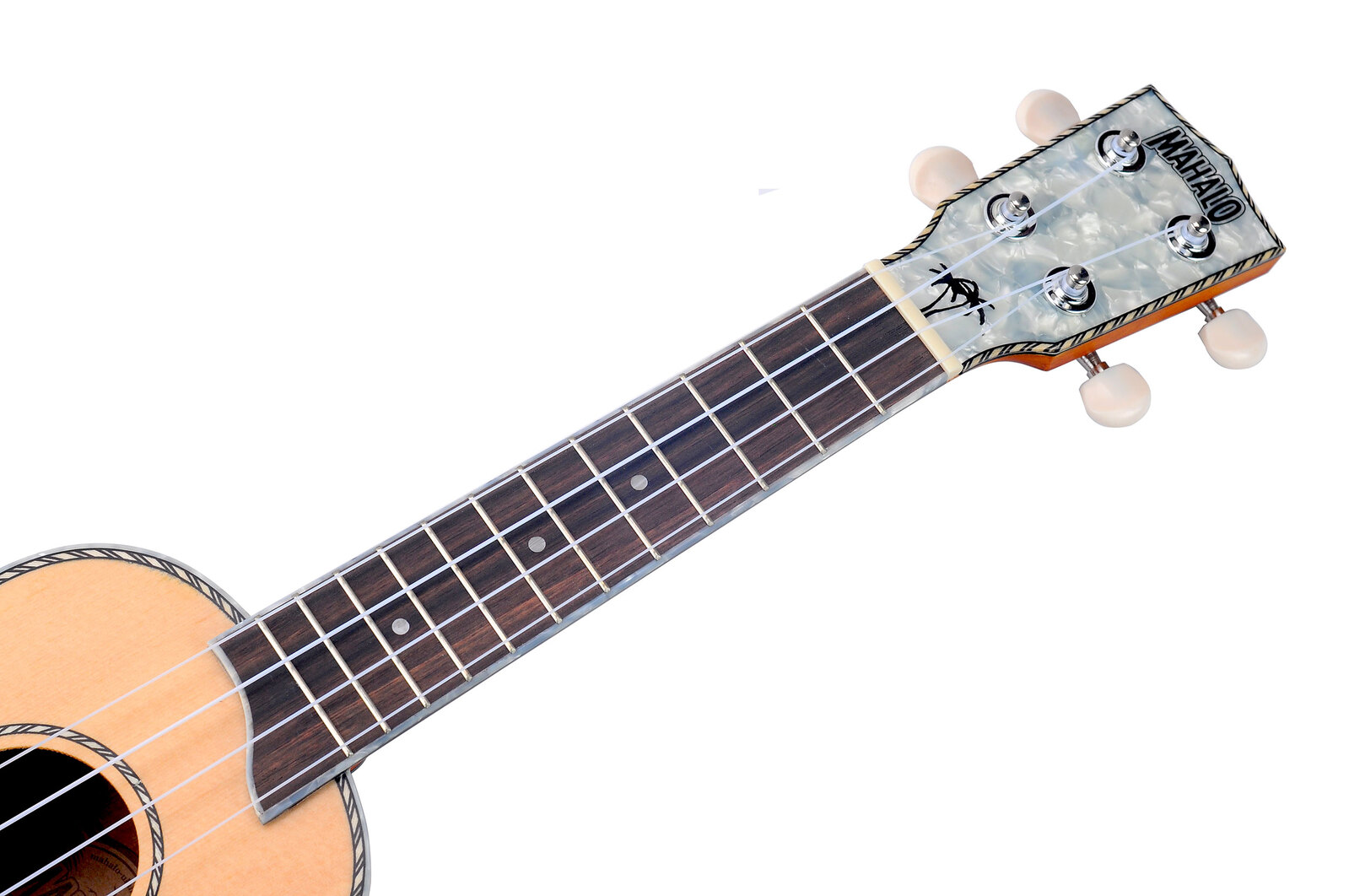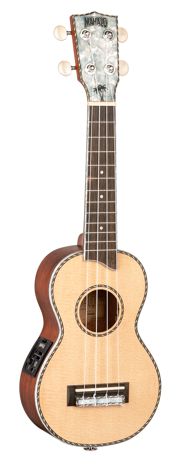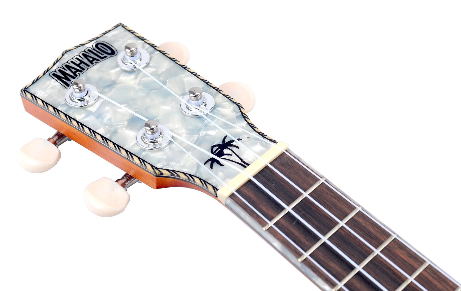 Our master luthiers are committed to producing finely handcrafted instruments with an artistic edge, and the PEARL SERIES is the result of this commitment. We are proud to introduce this series to players around the world seeking professional-grade instruments with a unique look and sound. Our Sitka spruce tops provide precise clarity and incredible dynamic response while mahogany bodies add sustain and warmth to the tone. A smooth mahogany neck with ebony fingerboard offers amazing response and smooth playability across the entire surface of the neck. A genuine ebony bridge and Graph Tech NuBone XB saddle add to the resonance and durability of this magnificent instrument. To match these premium specifications, PEARL SERIES instruments feature skilfully crafted pearloid veneers and wood inlays all around the headstock, neck, body and bridge to add a uniquely sophisticated touch. ELECTRIC ACOUSTIC MODEL. Fitted with stage ready piezo under-saddle pickup and MEQ2 on-board preamp system with 2-band EQ and built-in tuner - ready to plug in for a great sounding performance or recording. (Selected models only). MAHALO PEARL SERIES the perfect balance of great sound, stunning looks and effortless playability. SPECIFICATIONS TOP: Solid Sitka Spruce BODY: Mahogany with Arched Back TOP BINDING: Pearloid, 3 ply black/white binding with wood rope inlaid purfling HEADSTOCK VENEER: Pearloid, 3 ply black/white with wood Rope inlaid binding and Palm motif FINGERBOARD: Ebony with wave shaped end detail NECK: Mahogany NECK BINDING: Pearloid, 3 ply black/white POSITION MARKERS: Inlaid Celluloid NECK SIDE DOTS: Yes NECK HEEL: Pearloid, 3 ply black/white cap with Palm motif FRETS: 12, Nickel BRIDGE: Ebony TIE BLOCK MOSAIC: Pearloid, with wood Rope inlaid binding TOP NUT: ABS, White BRIDGE SADDLE: Graph Tech NuBone XB ROSETTE DECORATION: Wood Rope inlaid. MACHINE HEADS: Vintage, Nickel Plated with Cream buttons STRAP BUTTON: Nickel STRINGS: Aquila, Super Nylgut SCALE LENGTH: Soprano: 346mm NUT WIDTH: 34mm FINISH: Matt ELECTRONICS: MP1E Model - Mahalo MEQ2 On-board Preamp with Tuner Heavy Duty Carry Bag with Shoulder Strap Included
