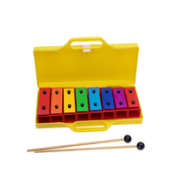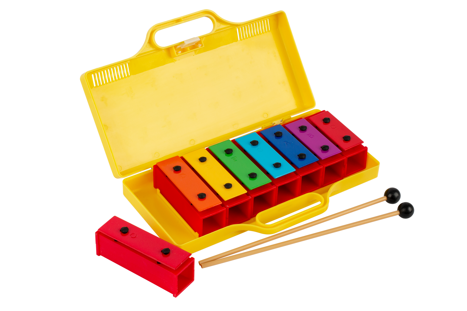 8 small coloured chimes mounted on plastic uncapped resonators. Yellow plastic carry case. Complete with 2 beaters. Diatonic. C6 - C7.