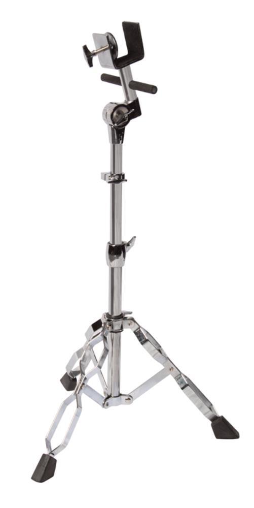 Heavy duty double braced bongo stand. Chrome plated. Rubber padded support arm with vertical adjustment. Cog tilt adjustment. Memory lock with thumb screw adjustment. 2 piece height adjustable 80cm to 105cm. 53mm max. holder width.