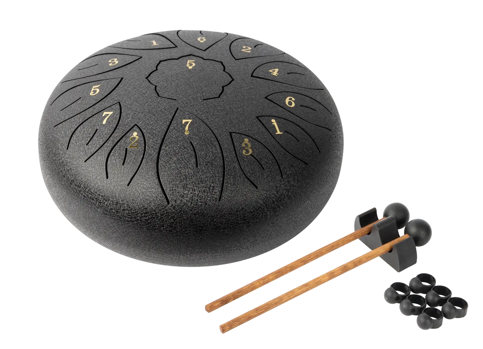 C Diatonic. Hand crafted from high grade steel-titanium alloy, coated with a durable paint that protects against tarnishing, scuffs and scratches. These drums produce a clean, bell like, ethereal tone. 13 hand tuned notes. Supplied with mallets, mallet holder, six rubber finger pads, instructional song booklet and with heavy duty carry bag with shoulder strap. Black.