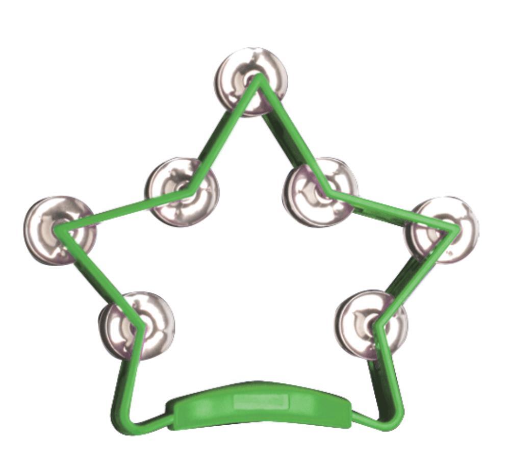 Mano Percussion 8 ½" x 7 ½" tambourine comes in a playful star shape and is an excellent learning tool able to develop an indivuduals sense of rhythm, made eco-friendly. This model comes in a polished, emerald green.