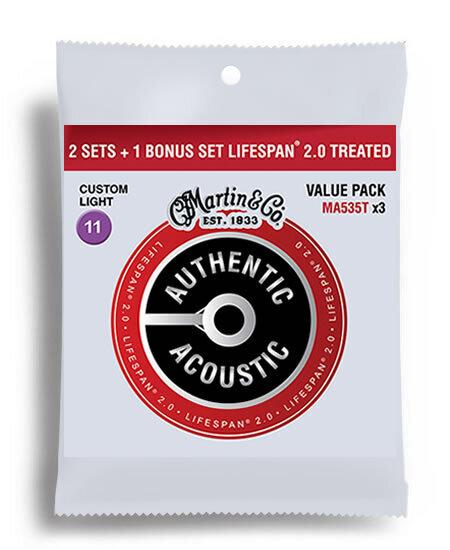 These Martin Authentic Acoustic Value Packs are available for a limited time only! Three sets of strings for only $51.98 - a saving of $25.99. Each value pack comes with three sets of Authentic Acoustic Lifespan 2.0 strings for the price of two. Available in Phosphor Bronze 11 (Custom Light) or 12 (Light)