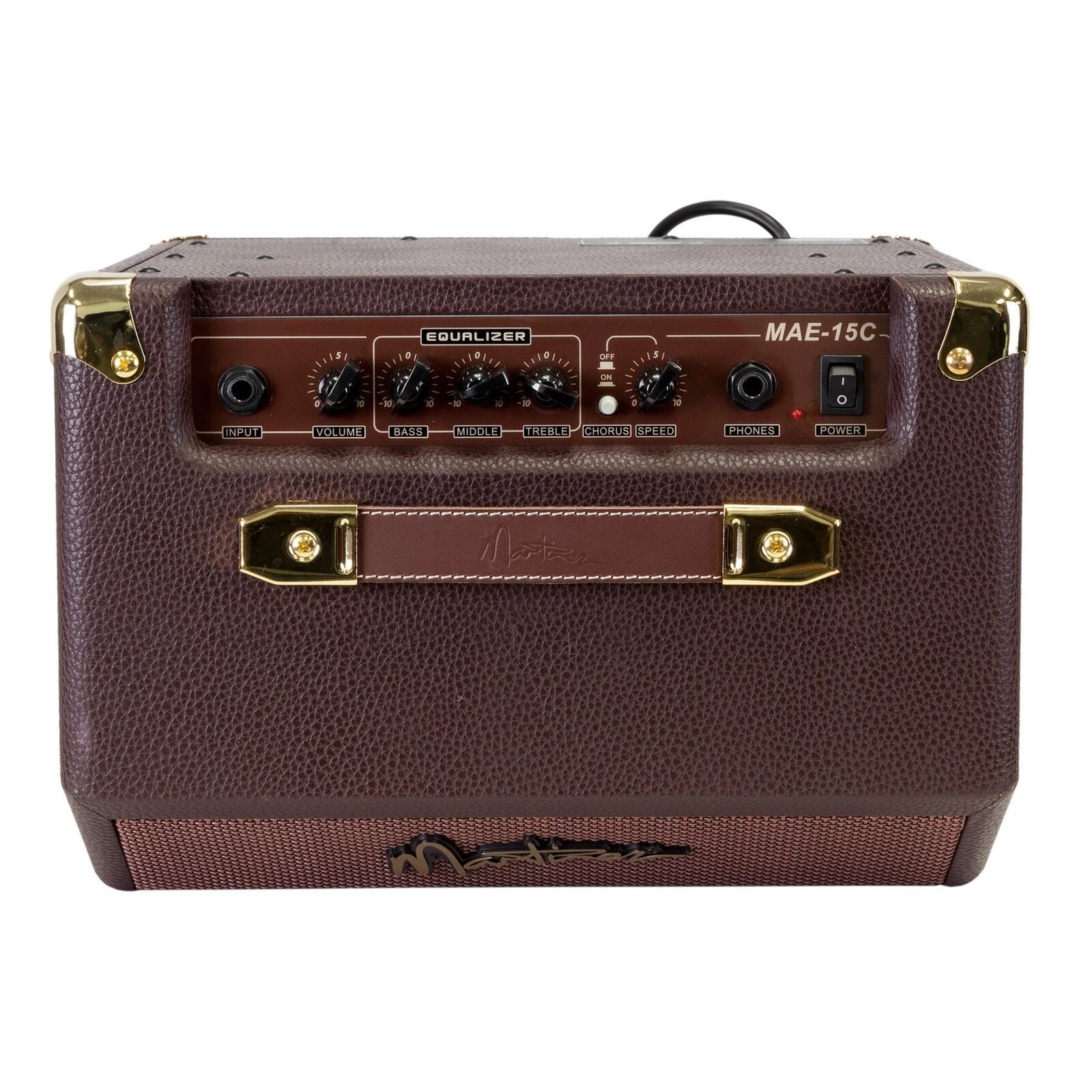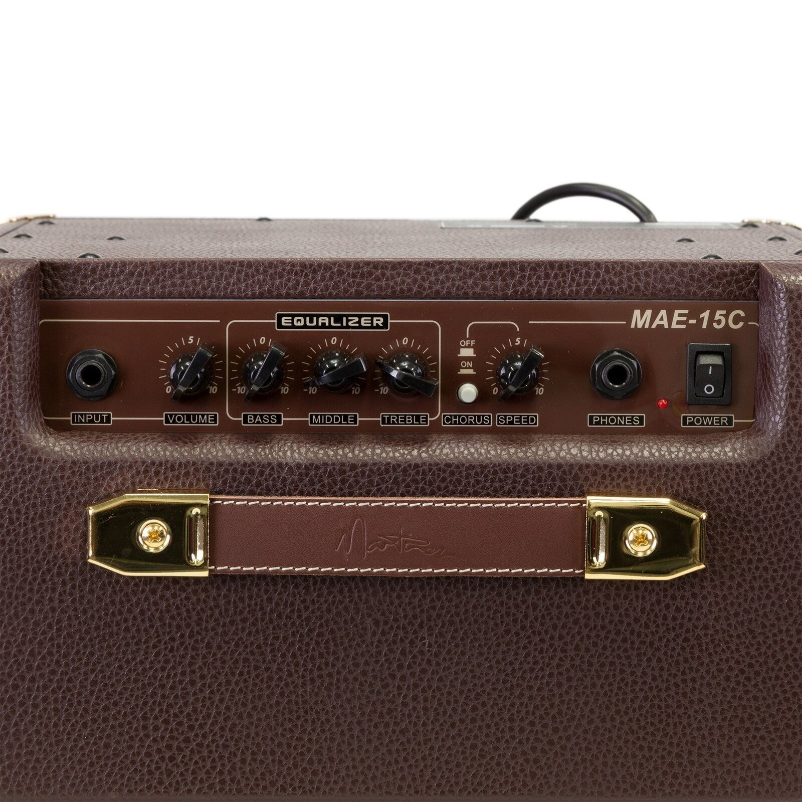 The Martinez MAE-15C-BRN Retro-Style Acoustic Guitar Amplifier with Chorus packs a punch, pushing out a solid 15 watts of power.