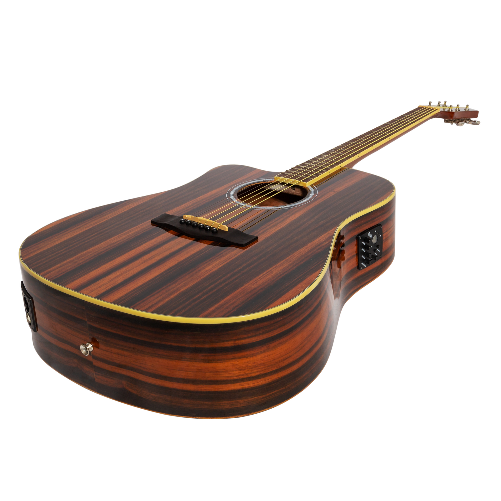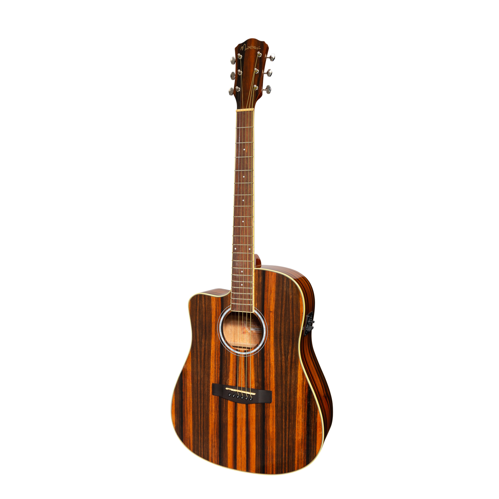 The Martinez '51 Series' Acoustic-Electric Dreadnought Cutaway Guitar Koa (Gloss) combines head turning good looks, with classic dreadnought construction, to deliver a uniquely beautiful playing and sounding guitar.