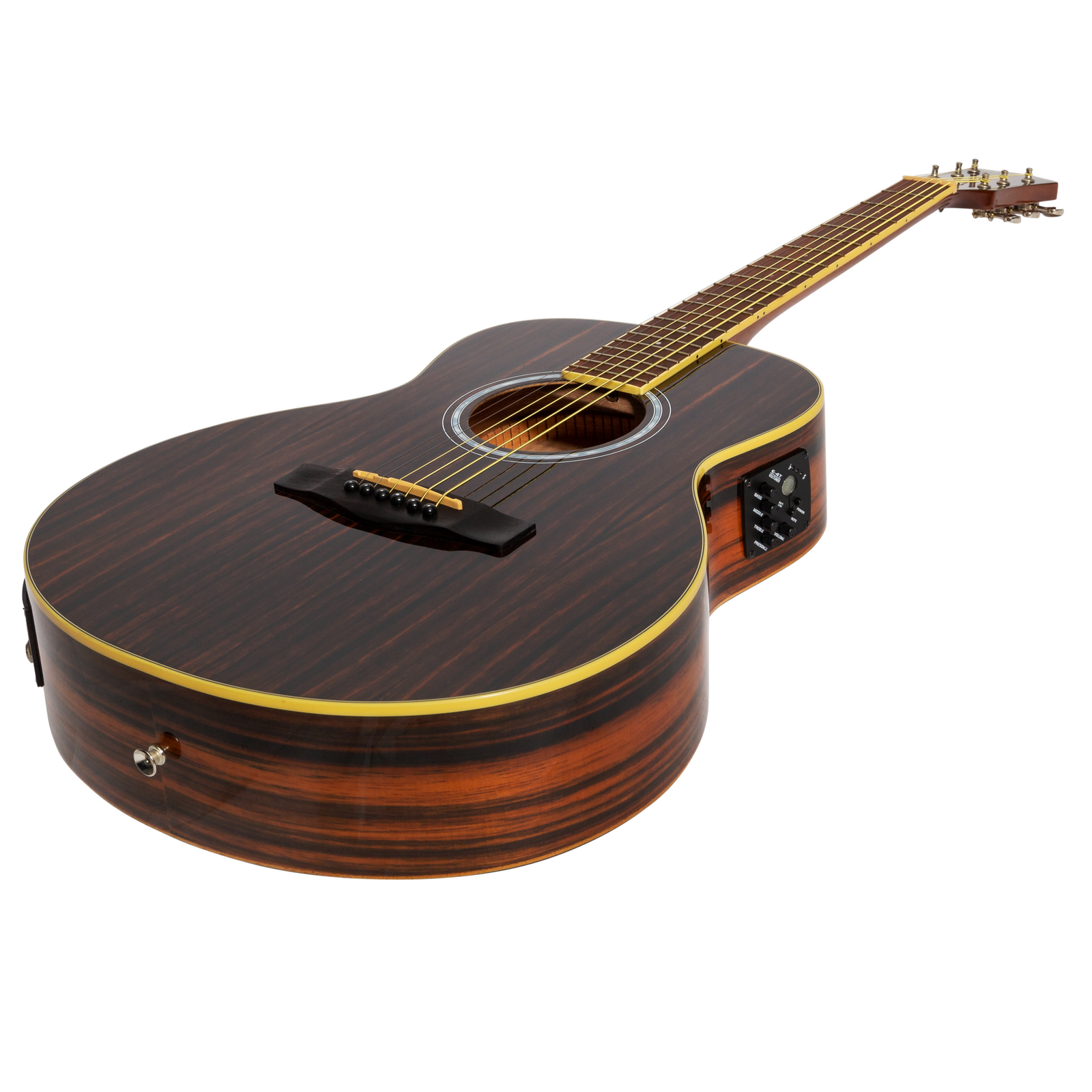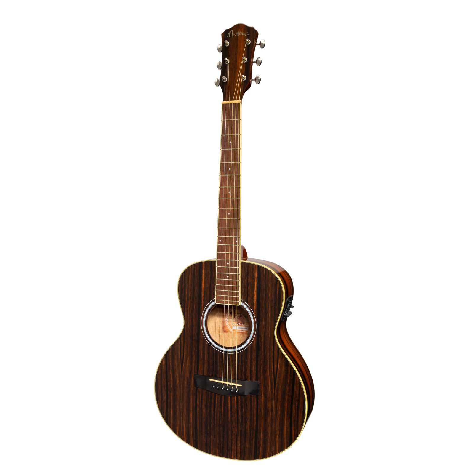 The Martinez '51 Series' Acoustic-Electric Short Scale Guitar Amara (Gloss) is a fantastic smaller-bodied acoustic, ideal for travelling musicians or players wanting the added comfort of a compact guitar without having to sacrifice tone.