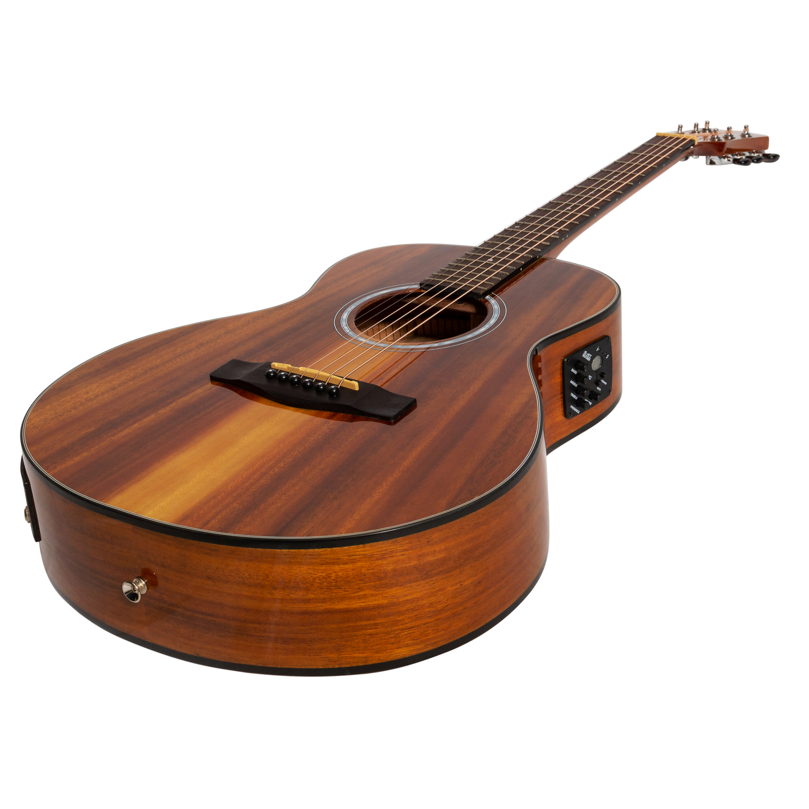 The Martinez '51 Series' Left Handed Acoustic-Electric Short Scale Guitar Koa (Gloss) is a fantastic smaller-bodied acoustic, ideal for travelling musicians or players wanting the added comfort of a compact guitar without having to sacrifice tone.