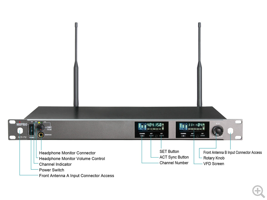 MIPRO Dual Channel Wideband Diversity Receiver. 1 RU metal rack mountable receiver. 400 preset channels over an impressive 72MHz of spectrum. Detachable antenna, XLR outputs per channel, plus a mixed XLR out. Features Auto Scan and ACT for one-button frequency sync to transmitters. Control and monitor up to 64 receiver channels via optional MIPRO-DVU USB dongle and software. 6UA frequency band.