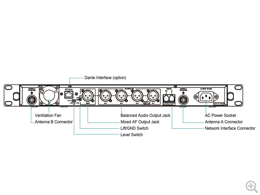 MIPRO Four Channel Wideband Diversity Receiver with Dante. 1 RU metal rack mountable receiver. 400 p