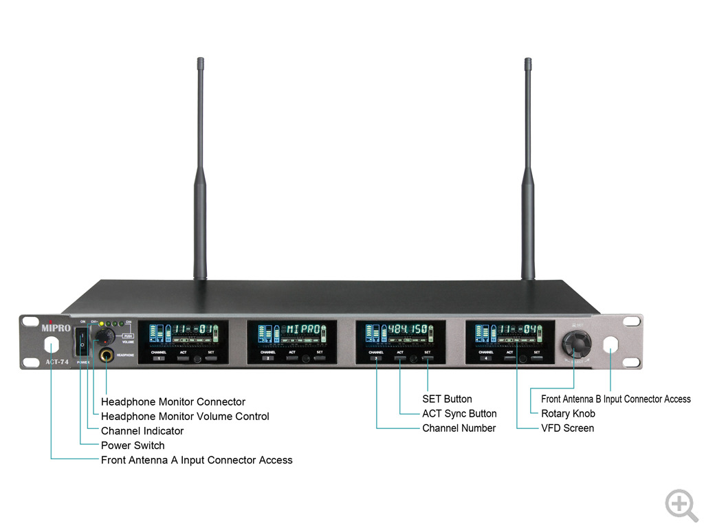 MIPRO Four Channel Wideband Diversity Receiver with Dante. 1 RU metal rack mountable receiver. 400 preset channels over an impressive 72MHz of spectrum. Detachable antenna, XLR outputs per channel, plus a mixed XLR out. Dante port for digital CAT5e connection to a Dante network. Features Auto Scan and ACT for one-button frequency sync to transmitters. Control and monitor up to 64 receiver channels via optional MIPRO-DVU USB dongle and software. 6UA frequency band.