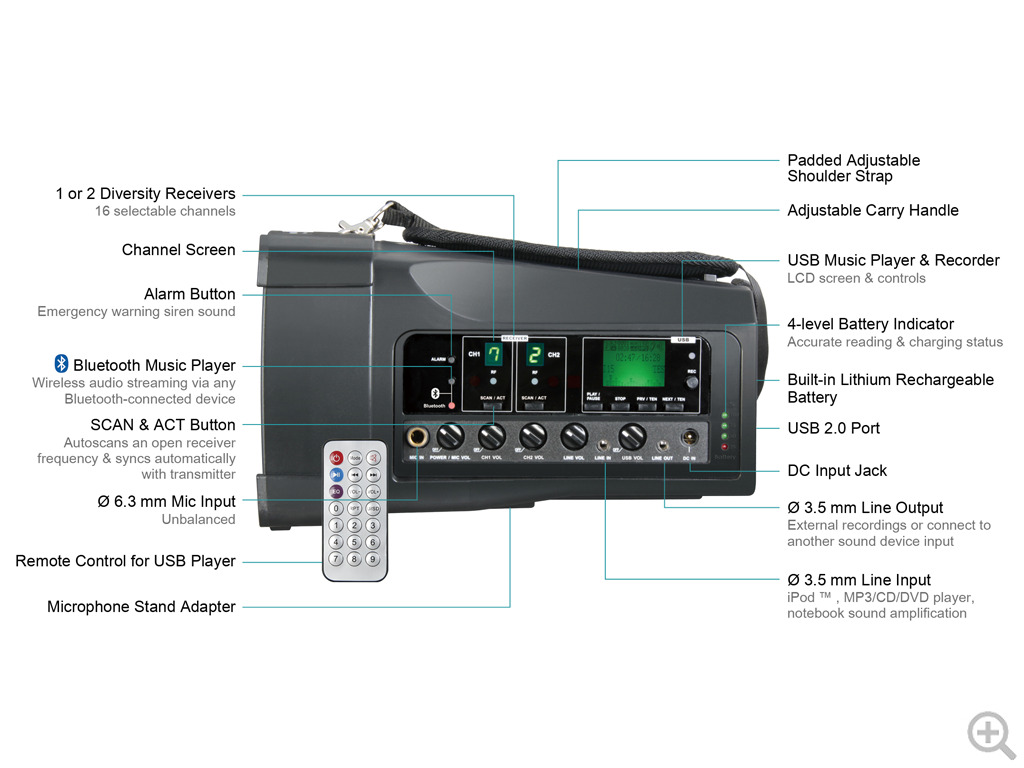 Package Includes: The price listed here is for the Mipro MA100DB-5 (Dual Receiver) PA system with USB Music Player/Recorder.