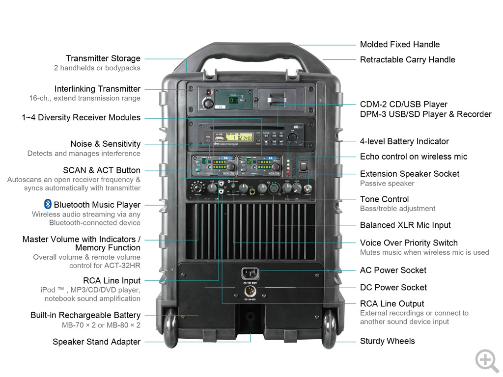 MIPRO Portable PA, 190 Watts with Bluetooth and Wireless Mic Receiver. 8" woofer, 1" compression driver. Integrated dual gel cell batteries. XLR and 6.35mm Mic Inputs, Single RCA Line Input, Single RCA Line Output. Use on a table or speaker stand. Can be optioned with up three more wireless mics with MRM70B single or a MRM72B dual wireless module, and CDM2 CD/USB Player Module. 5NB frequency band. 16.3kg.