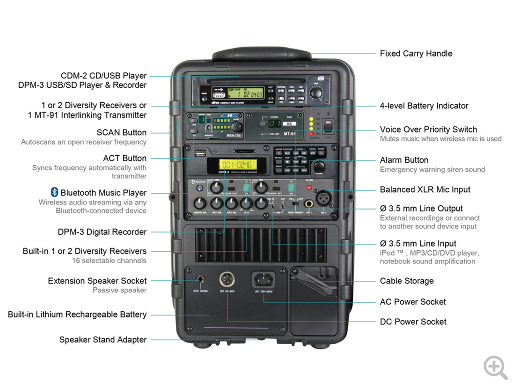 MIPRO Portable PA, 100 Watts with Bluetooth audio player. 8" woofer and 1" HF driver. Supplied with integrated DPM3 USB/SD Player/Recorder. Includes integrated rechargeable lithium battery. XLR Mic Input, 6.35mm Mic Input, 3.5mm Line Input, 3.5mm Line Output. Also includes one-button alarm/siren. Use on a table or speaker stand. Can be optioned with up to two wireless modules (any combination of MRM70B receiver or MT91 interlink transmitter), or CDM2 CD/USB Player Module. 8.5kg.