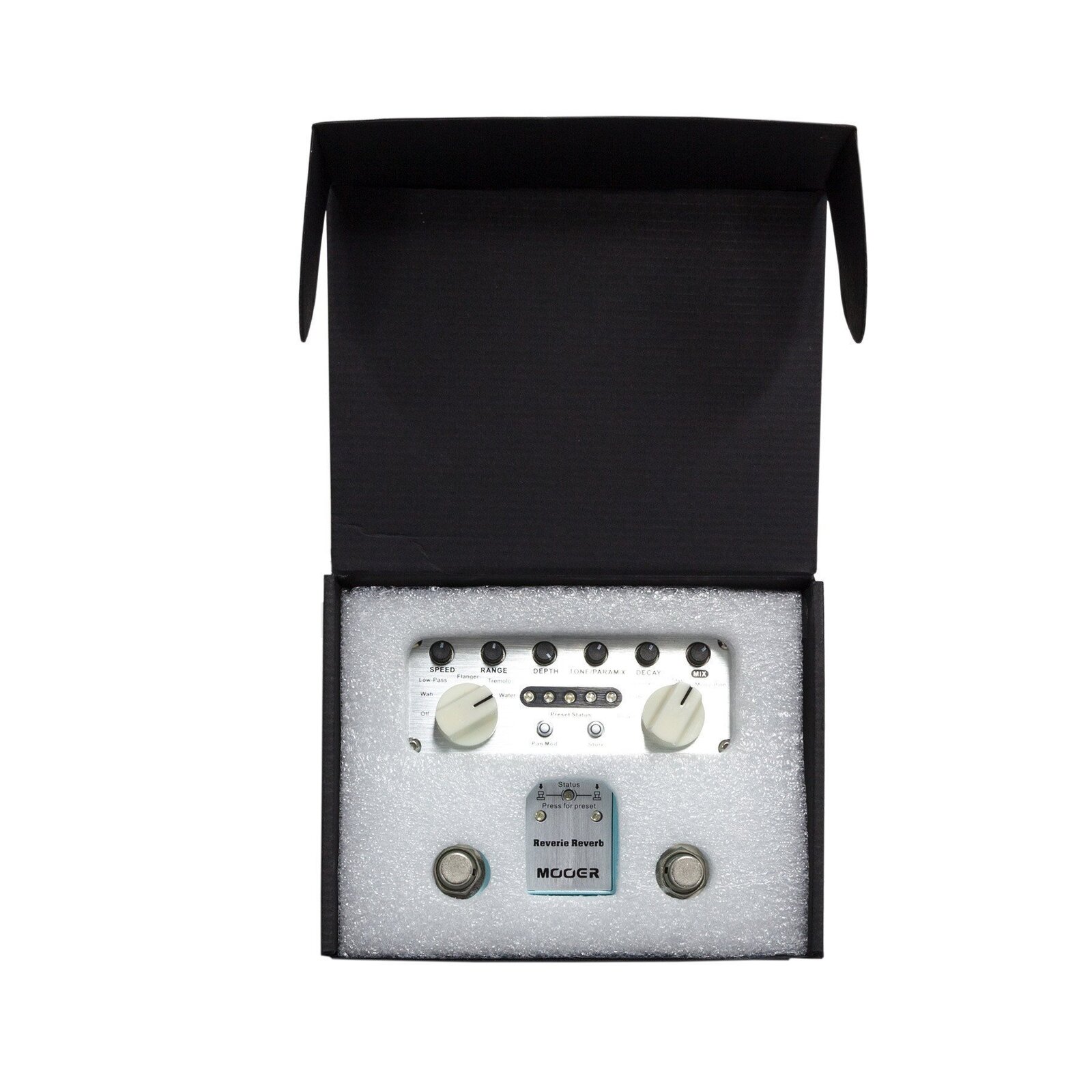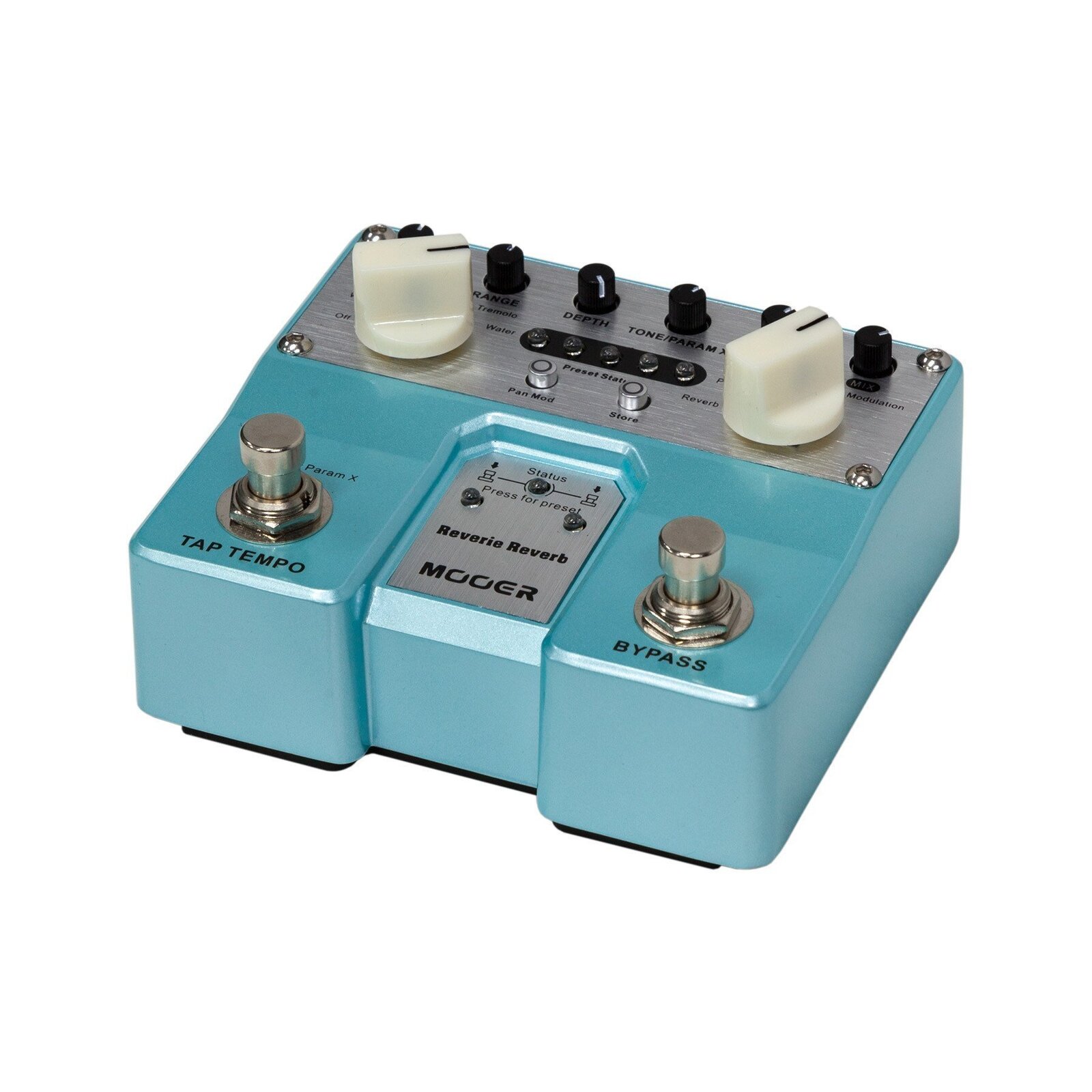 The Mooer MEP-REVREV Reverie Reverb is a compact dual effects pedal housing 5 unique basal reverb tones: Reverb, Plate, Shimmer, Octave and Modulation. Each could be fit for the Wah, Low-Pass, Flanger, Tremolo and Water effect respectively. You can also turn the modulation effect off to get pure reverb tone.