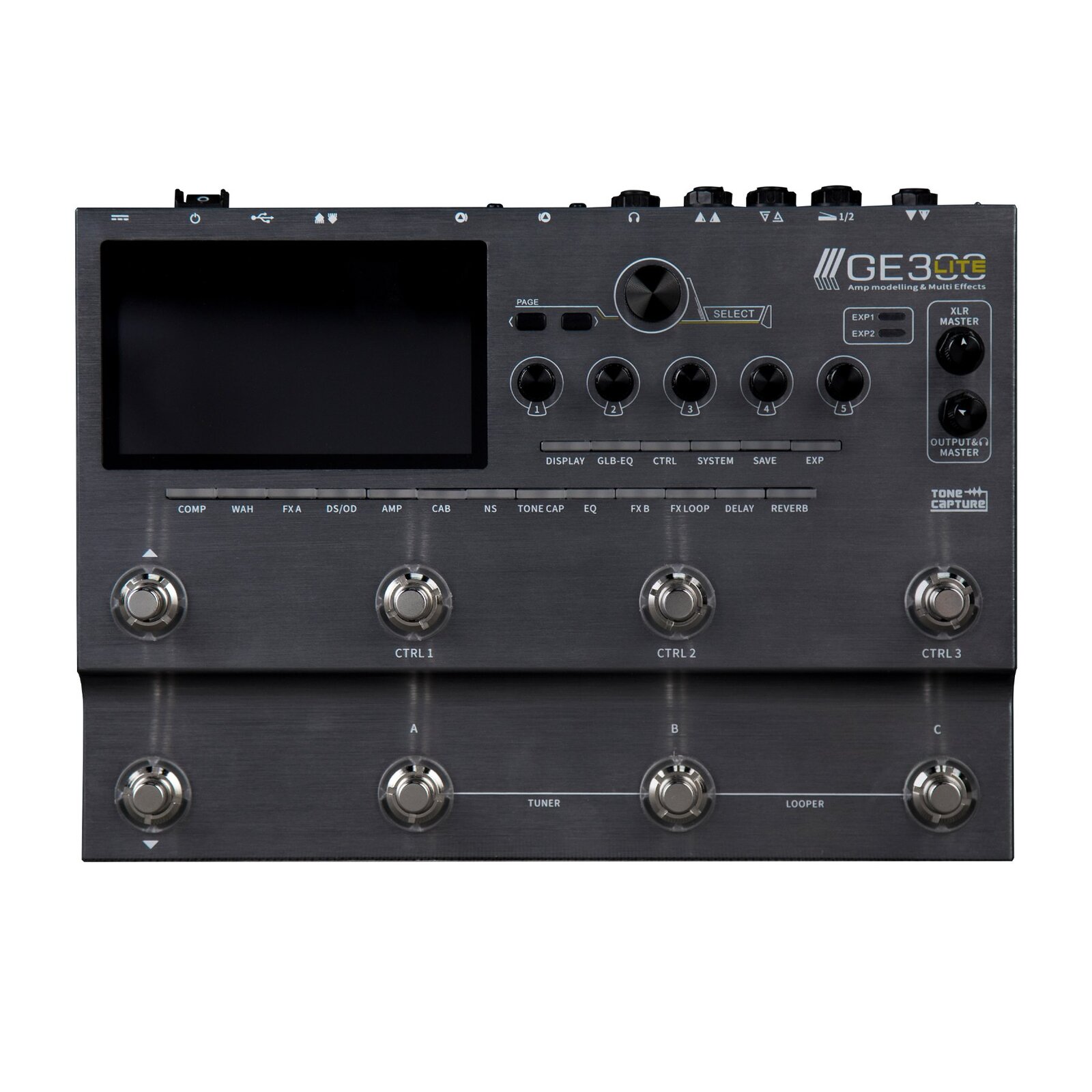 TONE CAPTURE is also included in the GE300Lite to allow digital recreations of guitars, amplifiers, and speaker cabinets. AMP MODE allows you to sample and capture your real-life amplifier, GUITAR MODE enables you to capture the EQ characteristics of your instrument, and CAB MODE provides an all-in-one tool to sample speaker cabinets and create your own IR files.