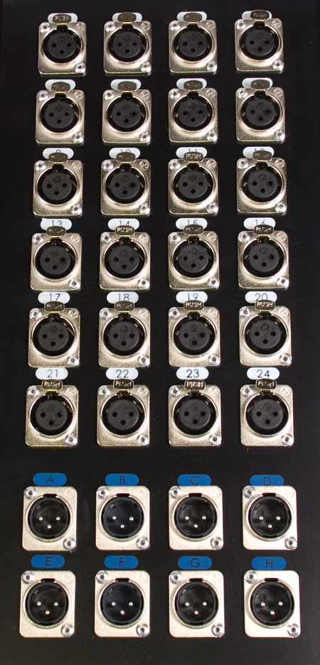 Features 24 XLR balanced send and 8 return channels. Instruments (DI Box) and microphones are plugged into the send inputs marked 1 to 24 on the stagebox. The signals are carried through the multicore to 24 corresponding XLR(m) number coded connectors.