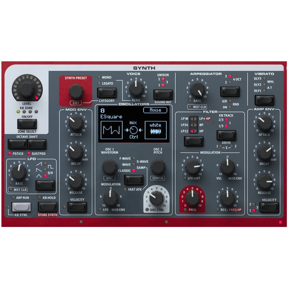 The Nord Stage 3 Synth section has the Nord Lead A1 Synth Engine combined with Sample Playback and comes with an outstanding selection of samples from our new Nord Sample Library 3.0 making it possible to create and transfer your own samples using the Nord Sample Editor and with its brilliant OLED display for all Oscillator functions you can build sounds and manipulate sound palletes . The Lead A1 Synth Engine is renowned for its analog-modelling warmth, and utilises brilliant Smart Oscillator Configurations to deliver stunning results with little programming. There are both Single oscillator setups including Pitch and Shape modes, and Dual oscillator setups including Detune, Sync, Waveform, Bell and Noise Mix modes, FM and Ring Mod. The Synth section also provides 3 Unison modes, without reducing voice polyphony. The Nord Stage 3's new Oscillator section features 5 oscillator categories: Classic, Wave, Formant, Sample and brand new Super Wave (S-wave).